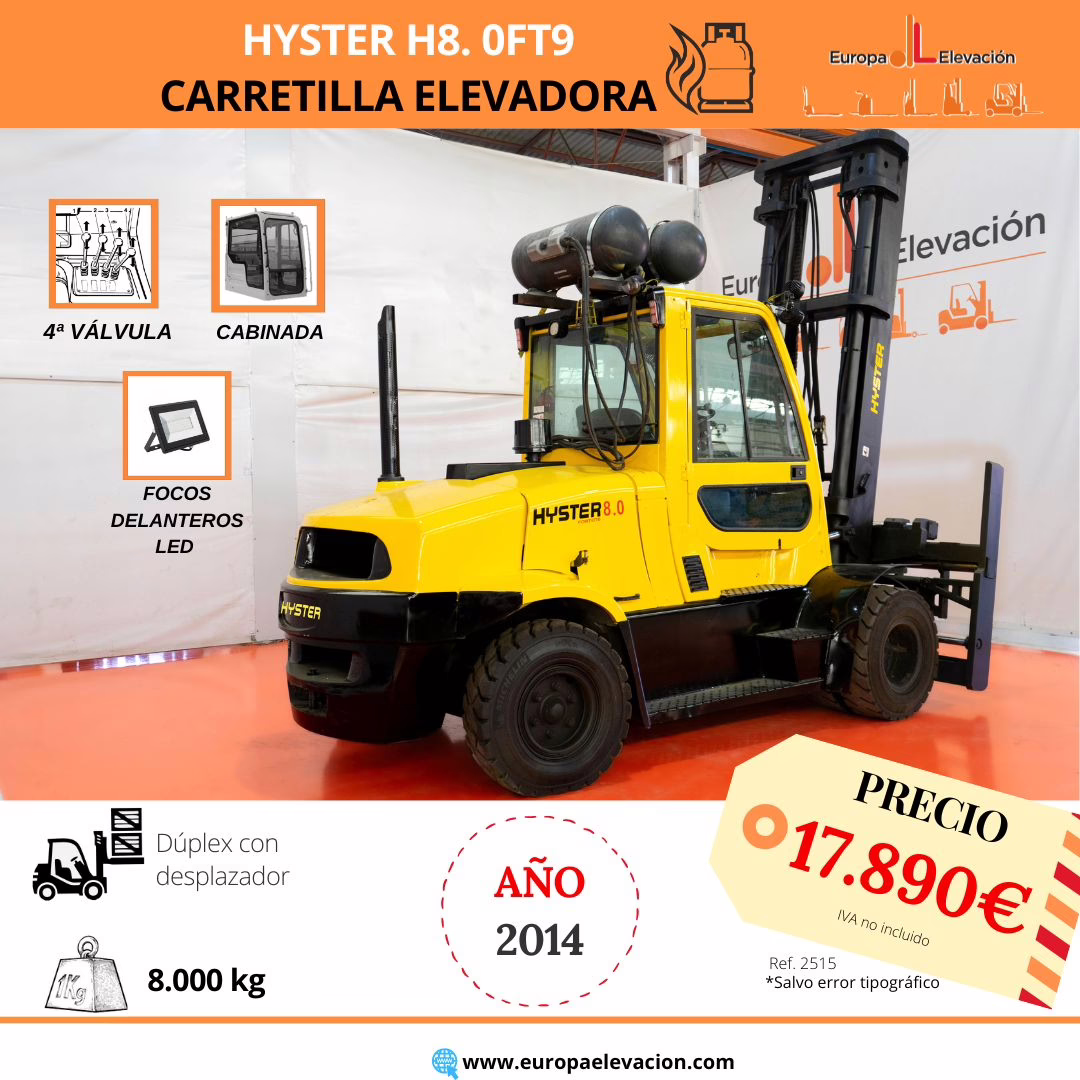 MÁQUINA FABRICADA EN 2014. 4ª VÁLVULA. CABINADA. Carretilla elevadora gas HYSTER. Capacidad: 8.000 kg. Mástil dúplex con desplazador. Focos delanteros LED de alta luminosidad. Respuesta rápida, eficiencia y muy buena maniobrabilidad Ref: 2515. Modelo: H8.0FT9. Europa Elevación. ¡Tenemos tu máquina! Llámanos sin compromiso. Disponemos de atención comercial 24 horas. Enviamos a toda España.