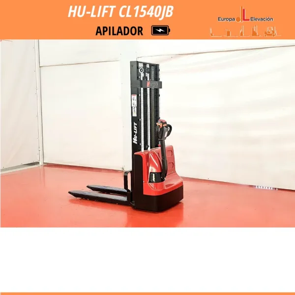 FRENO ELECTROMAGNÉTICO. BOTÓN TORTUGA. CARGADOR INCORPORADO. Apilador eléctrico HU-LIFT. Capacidad: 1.500 kg. Mástil dúplex, 4.000 mm. Respuesta rápida, eficiencia y muy buena maniobrabilidad Ref: HULIFT. Modelo: CL 1540-JB.