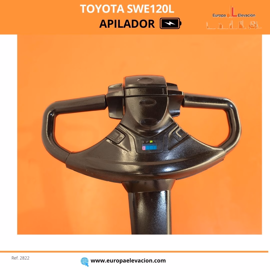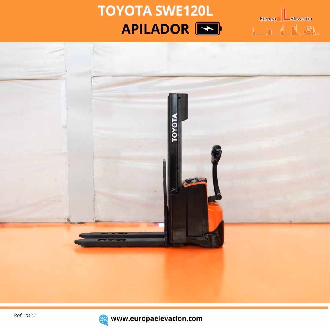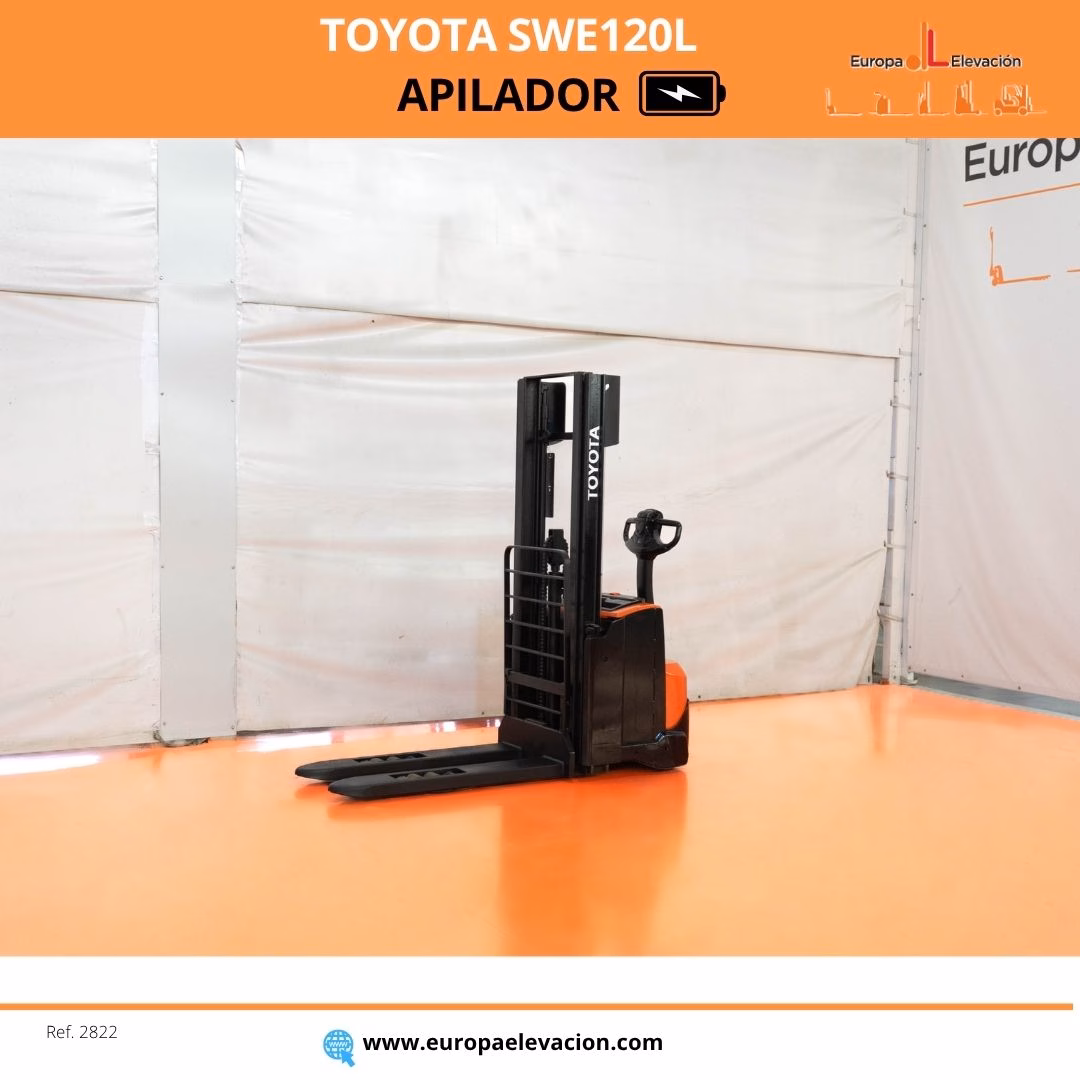 AÑO 2019. CON SOLO 847 HORAS. BATERÍA NUEVA CON 30 MESES DE GARANTÍA. BASE ALZABLE. ENCENDIDO POR CÓDIGO. Apilador eléctrico TOYOTA. Capacidad: 1.200 kg. Mástil dúplex con elevación libre, 2.900 mm. Respuesta rápida, eficiencia y muy buena maniobrabilidad. Ref: 2822. Modelo:SWE120L.