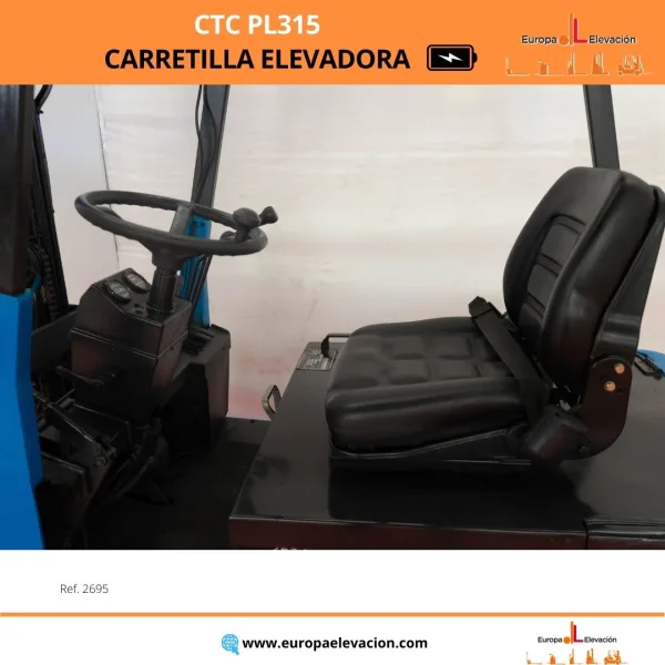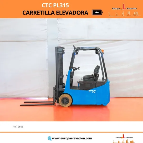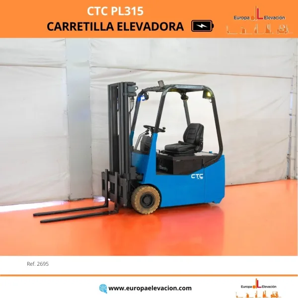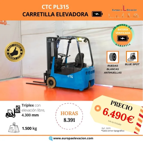 CON TAN SOLO 8.391 HORAS DE USO. BATERÍA VERIFICADA CON 12 MESES DE GARANTÍA. RUEDAS BLANCAS ANTIHUELLA. BLUE SPOT. Carretilla elevadora eléctrica CTC. Capacidad: 1.500 kg. Mástil tríplex con elevación libre, 4.300 mm. Respuesta rápida, eficiencia y muy buena maniobrabilidad. Ref: 2695. Modelo:PL315.