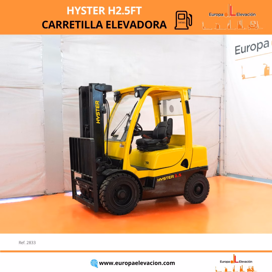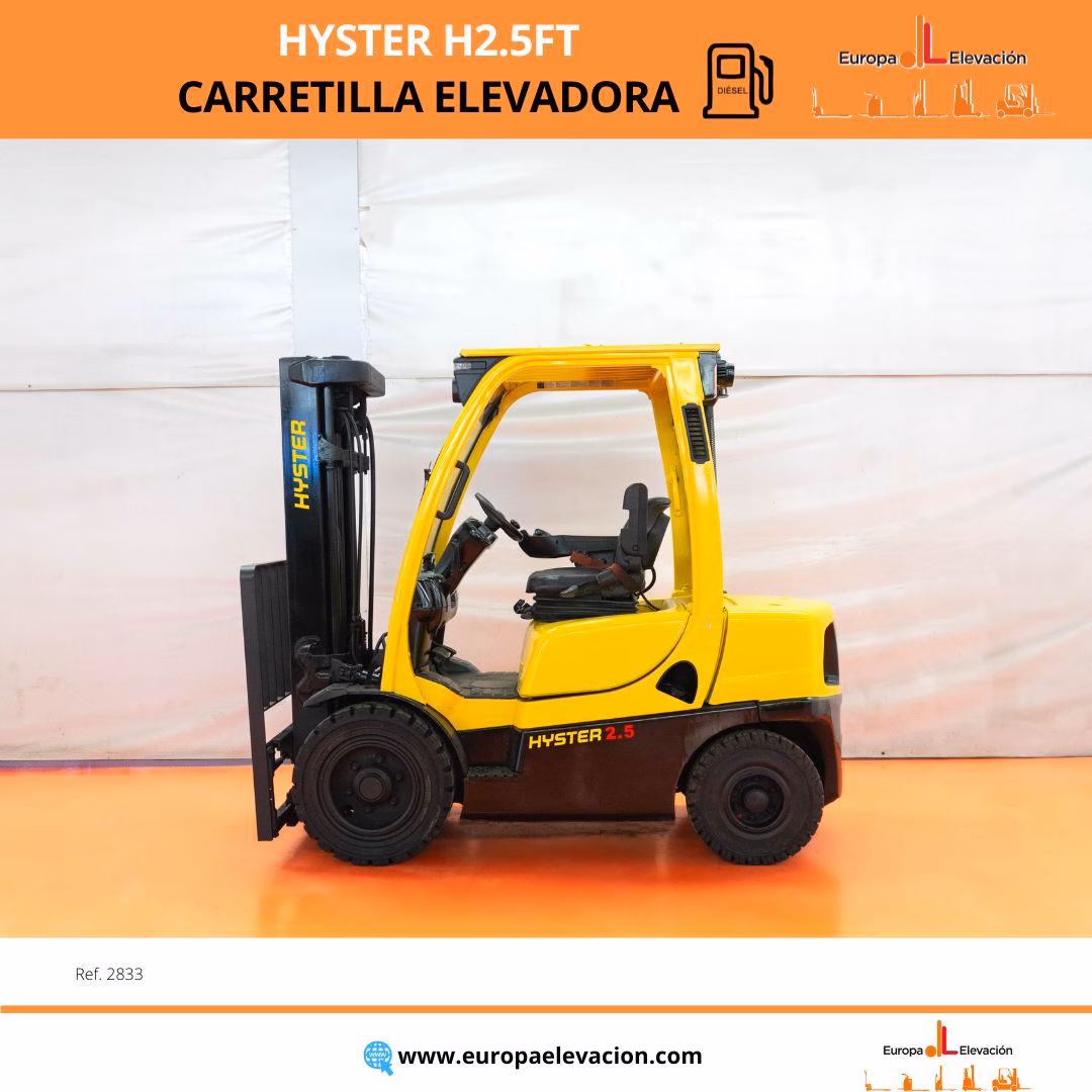 AÑO 2016. CON SOLO 3.563 HORAS. Carretilla elevadora diésel HYSTER. Capacidad: 2.500 kg. Mástil tríplex con elevación libre y desplazador, 5.000 mm. LUNA DELANTERA. RUEDAS TRASERAS NUEVAS. Focos delanteros y trasero LED de alta luminosidad. Respuesta rápida, eficiencia y muy buena maniobrabilidad. Ref: 2833. Modelo:H2.5FT.