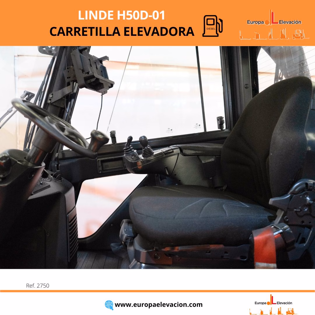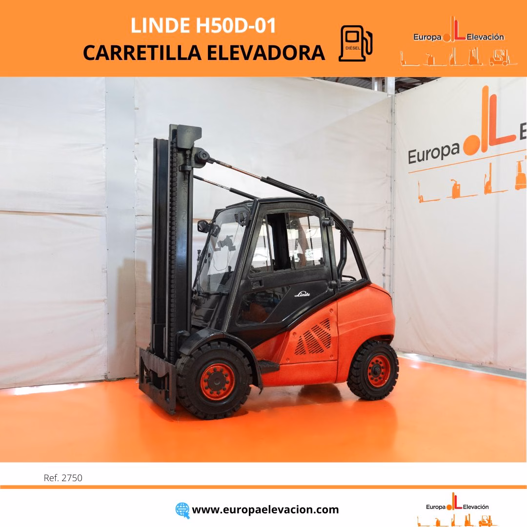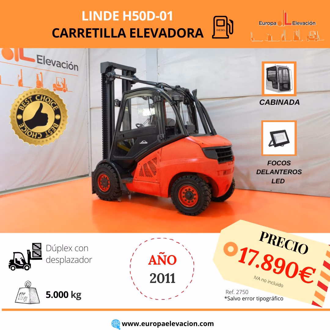 MÁQUINA FABRICADA EN 2011. CABINADA. Carretilla elevadora diésel LINDE. Capacidad: 5.000 kg. Mástil dúplex con desplazador. Luces delanteras LED de alta luminosidad. Respuesta rápida, eficiencia y muy buena maniobrabilidad. Ref: 2750. Modelo:H50D-01.