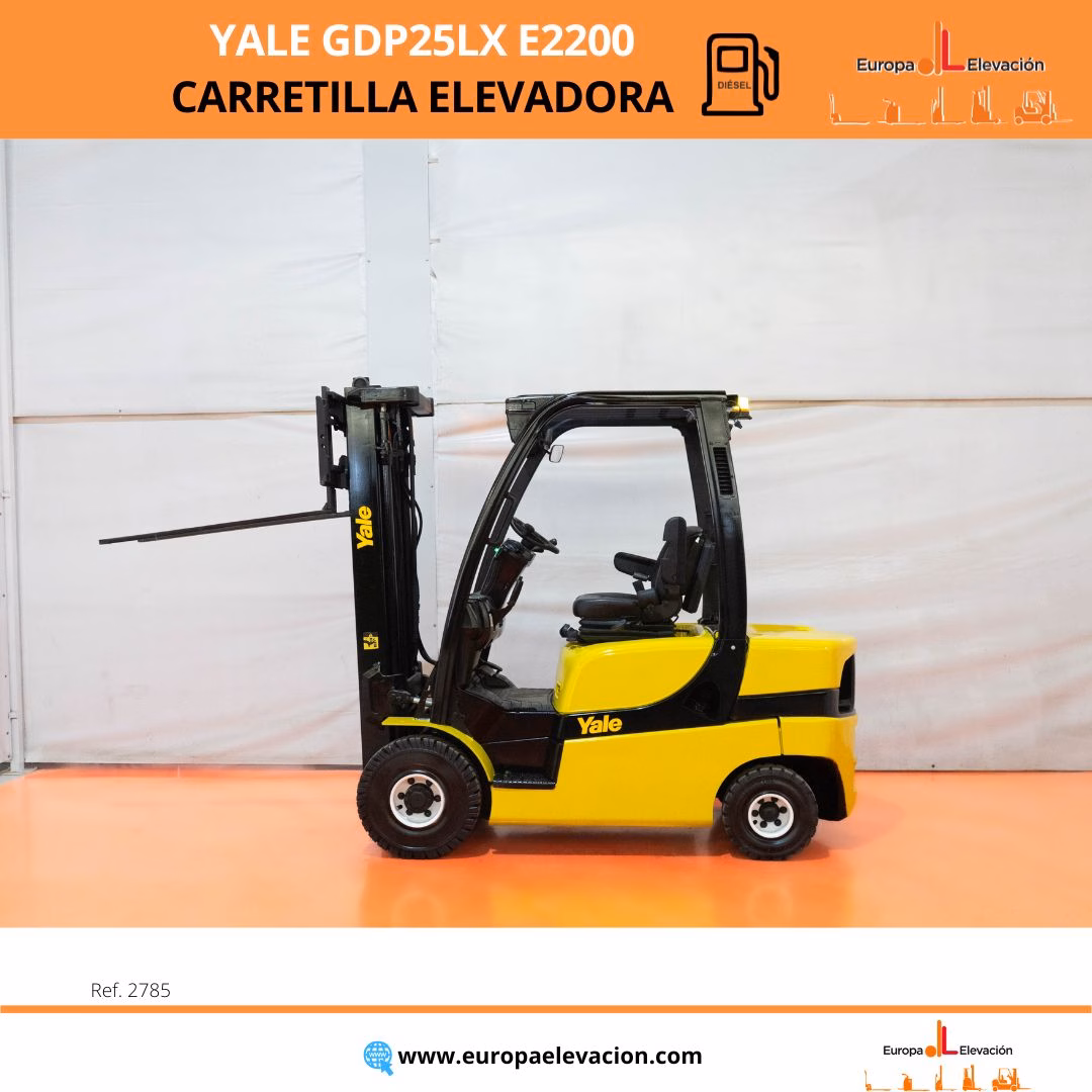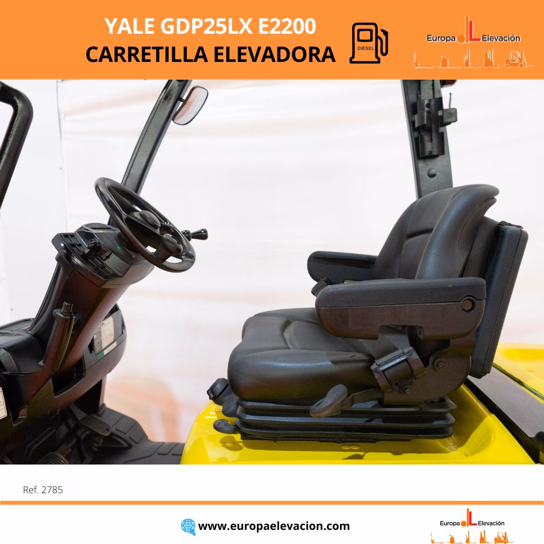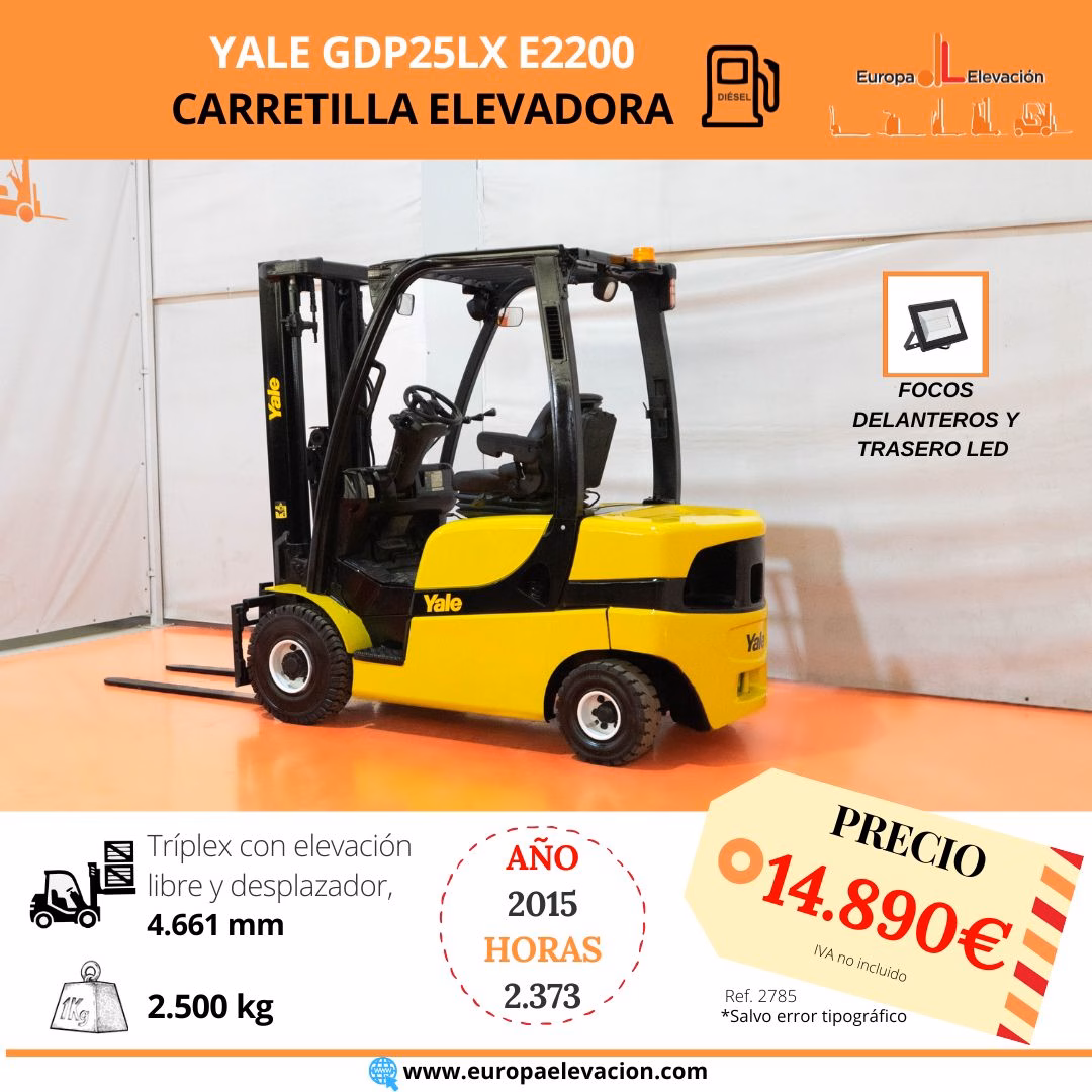 AÑO 2015. CON TAN SOLO 2.373 HORAS. Carretilla elevadora diésel YALE. Capacidad: 2.500 kg. Mástil tríplex con elevación libre y desplazador, 4.661 mm. Focos delanteros y trasero LED de alta luminosidad. Respuesta rápida, eficiencia y muy buena maniobrabilidad. Ref: 2785. Modelo:GDP25LX E2200.