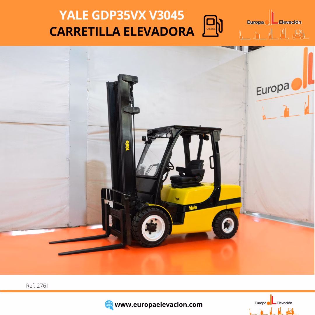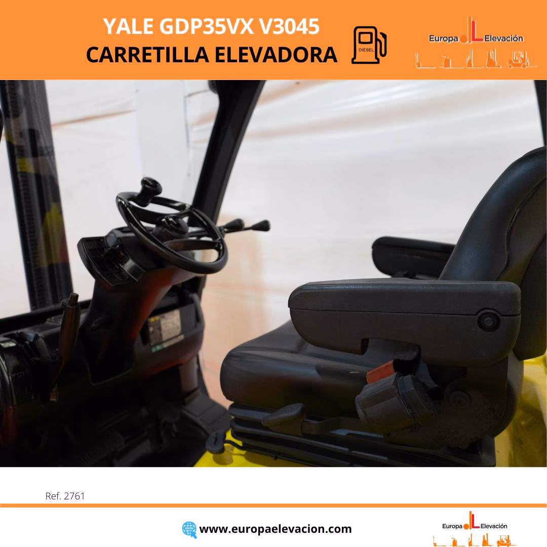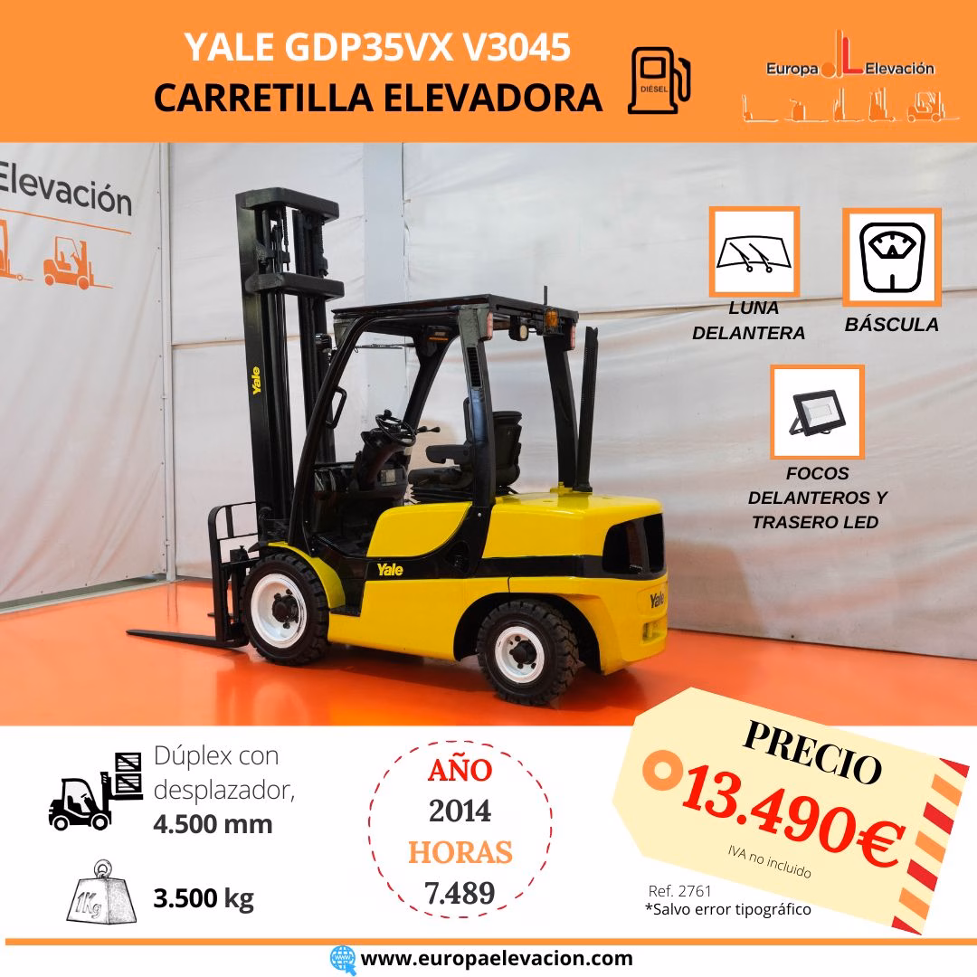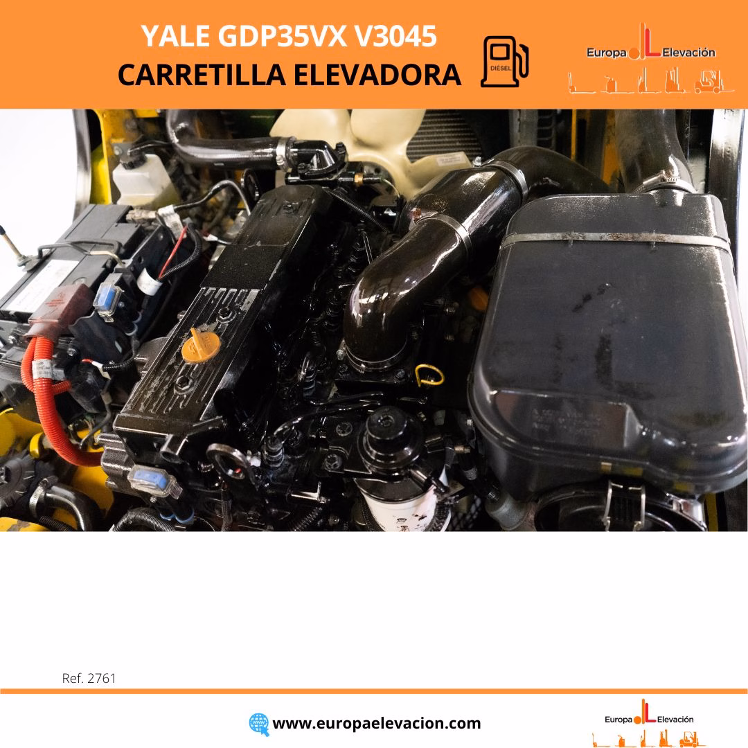 MÁQUINA FABRICADA EN 2014. CON TAN SOLO 7.489 HORAS DE USO. LUNA DELANTERA. BÁSCULA. Carretilla elevadora diésel YALE. Capacidad: 3.500 kg. Mástil dúplex con desplazador, 4.469 mm. Luces delanteras LED de alta luminosidad. Respuesta rápida, eficiencia y muy buena maniobrabilidad. Ref: 2761. Modelo:GDP35VX V3045.