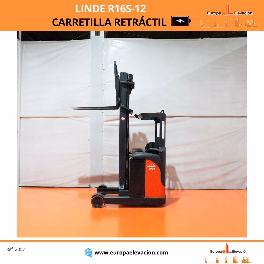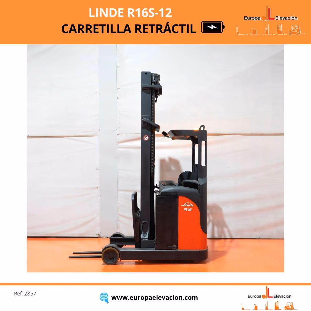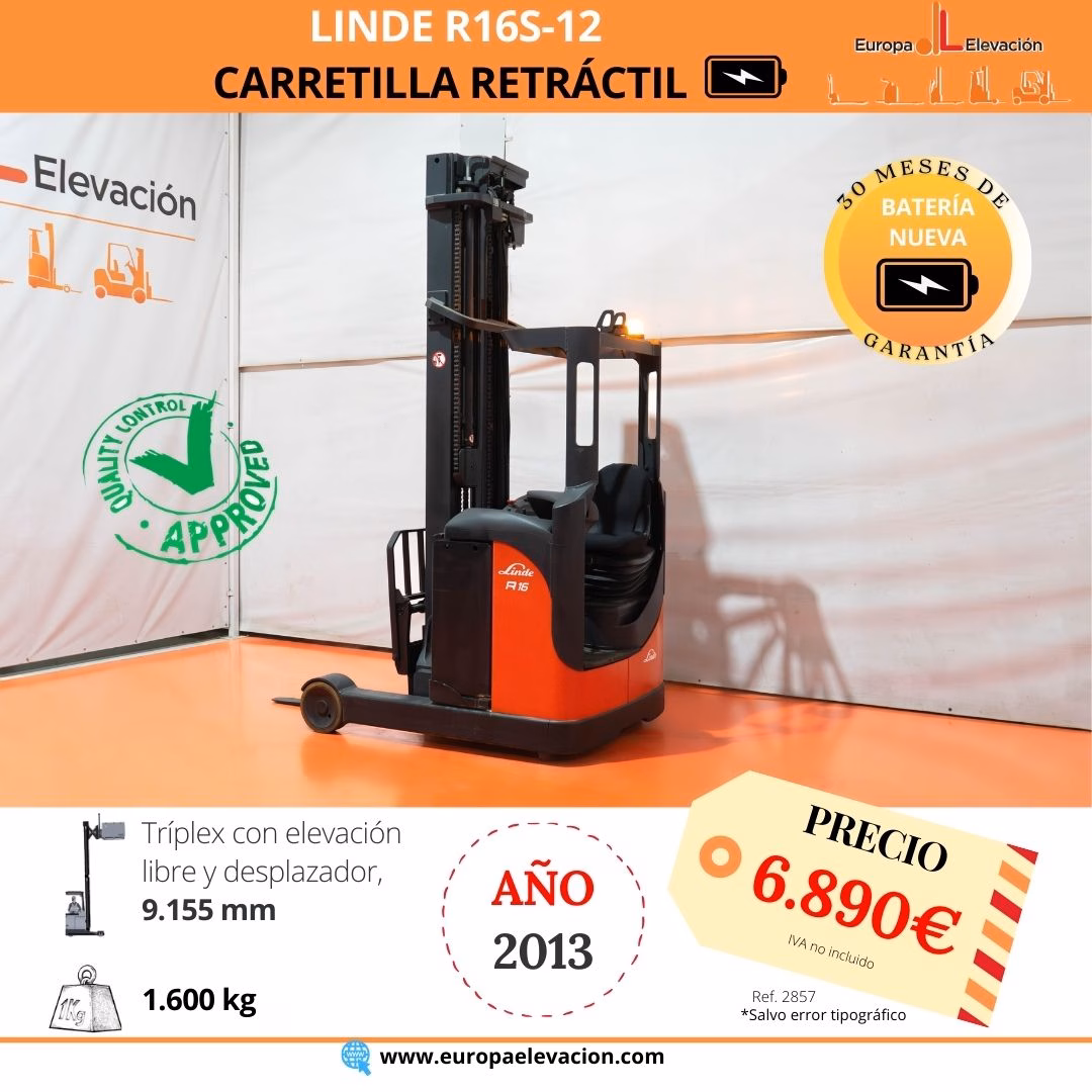 AÑO 2013. BATERÍA NUEVA CON 30 MESES DE GARANTÍA. Carretilla retráctil eléctrica LINDE. Capacidad: 1.600 kg. Mástil tríplex con elevación libre y desplazador, 9.155 mm. Respuesta rápida, eficiencia y muy buena maniobrabilidad. Ref: 2857. Modelo:R16S-12.