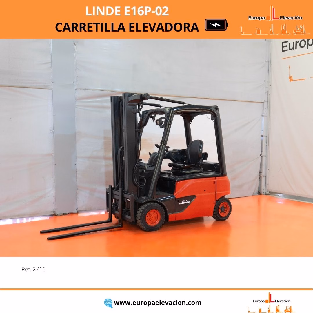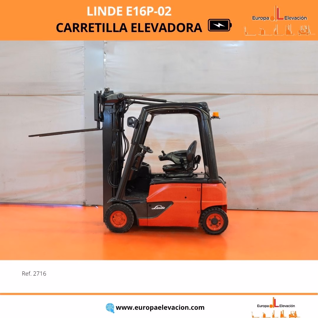 MÁQUINA FABRICADA EN 2019. CON TAN SOLO 6.330 HORAS DE USO. BATERÍA VERIFICADA CON 12 MESES DE GARANTÍA. Carretilla elevadora eléctrica LINDE. Capacidad: 1.600 kg. Mástil tríplex con elevación libre y desplazador, 4.575 mm. Focos delanteros LED de alta luminosidad. Respuesta rápida, eficiencia y muy buena maniobrabilidad. Ref: 2716. Modelo:E16PH-02.