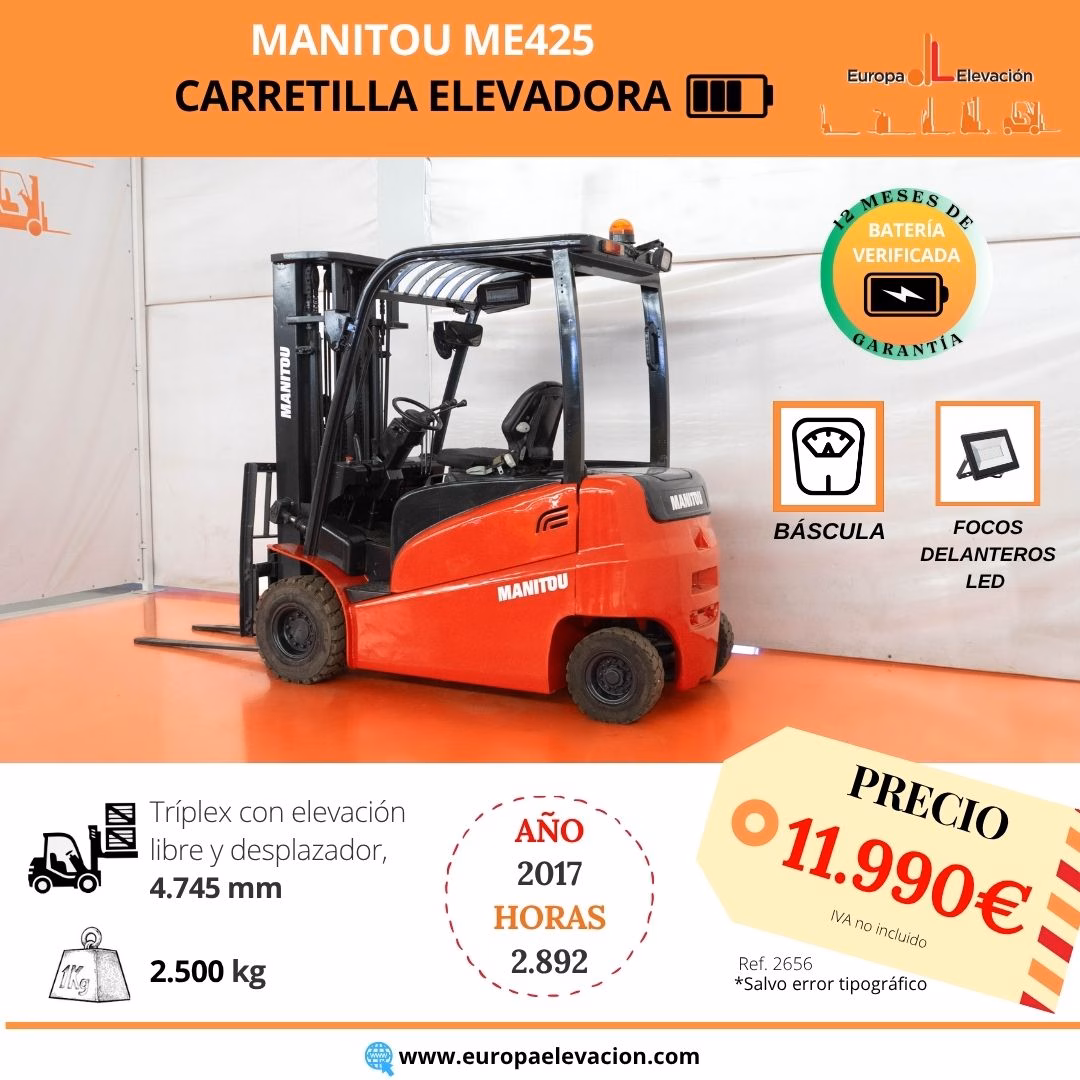MÁQUINA FABRICADA EN 2017. CON TAN SOLO 2.892 HORAS DE USO. BÁSCULA. BATERÍA VERIFICADA CON 12 MESES DE GARANTÍA. Carretilla elevadora eléctrica MANITOU. Capacidad: 2.500 kg. Mástil tríplex con elevación libre y desplazador, 4.745 mm. Focos delanteros y trasero LED de alta luminosidad. Respuesta rápida, eficiencia y muy buena maniobrabilidad. Ref: 2656. Modelo:ME425.