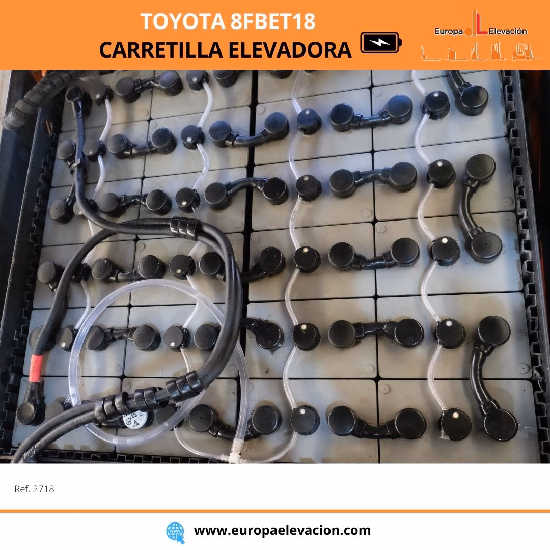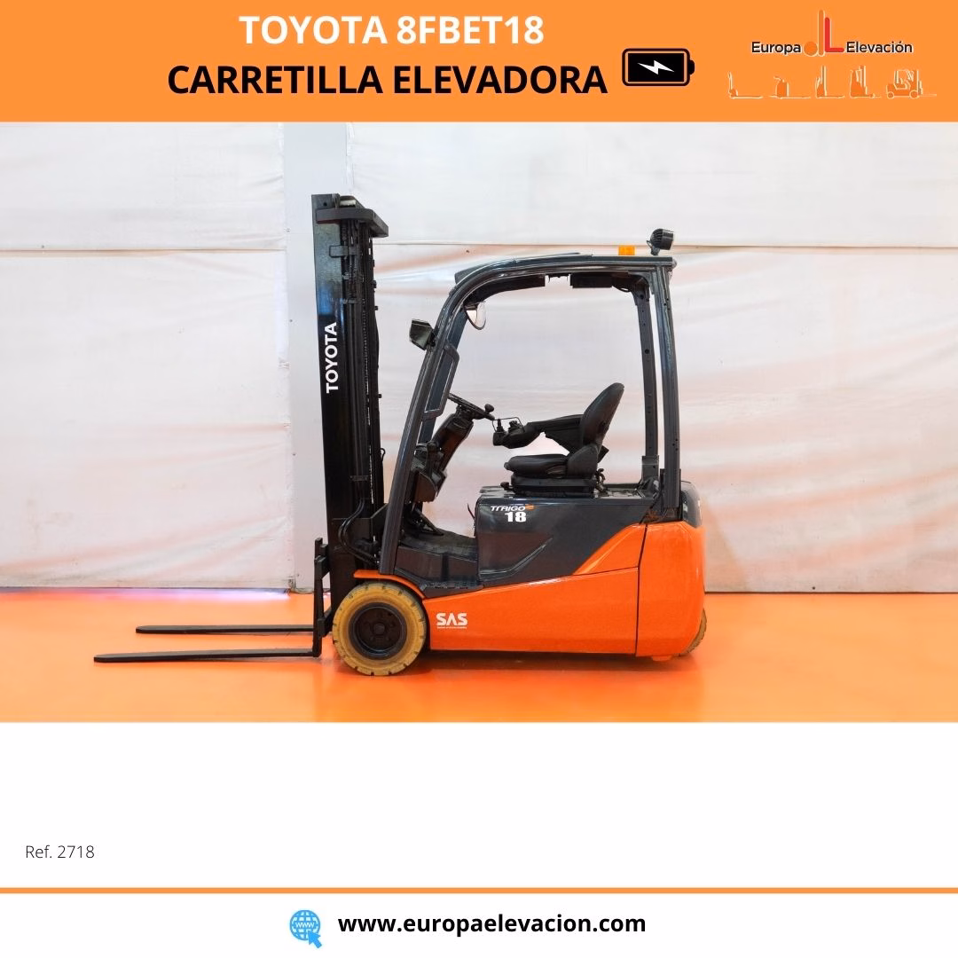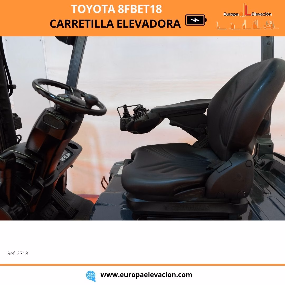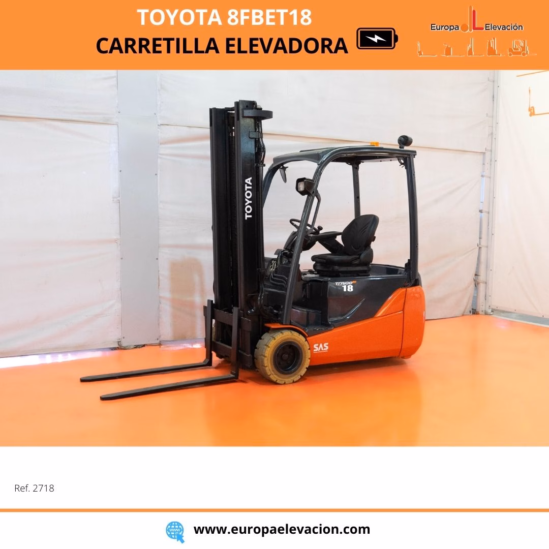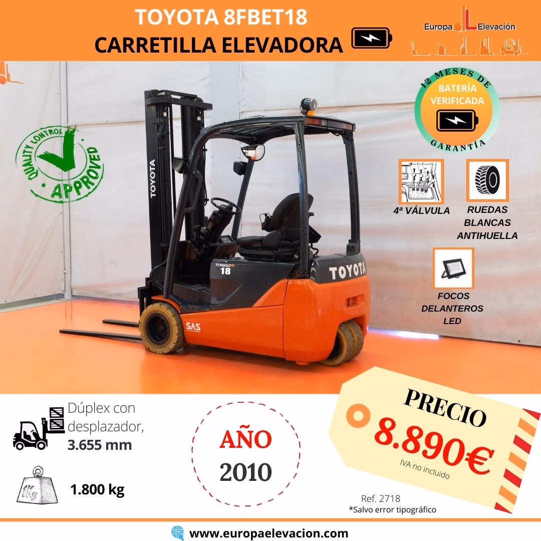 MÁQUINA FABRICADA EN 2010. 4ª VÁLVULA. RUEDAS BLANCAS ANTIHUELLA. BATERÍA VERIFICADA CON 12 MESES DE GARANTÍA. Carretilla elevadora eléctrica TOYOTA. Capacidad: 1.800 kg. Mástil dúplex con desplazador, 3.655 mm. Focos delanteros LED de alta luminosidad. Respuesta rápida, eficiencia y muy buena maniobrabilidad. Ref: 2718. Modelo:8FBET18.