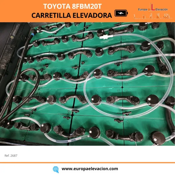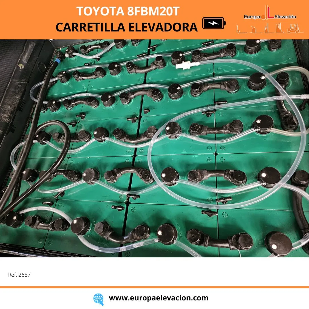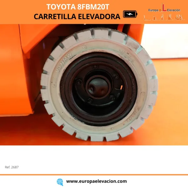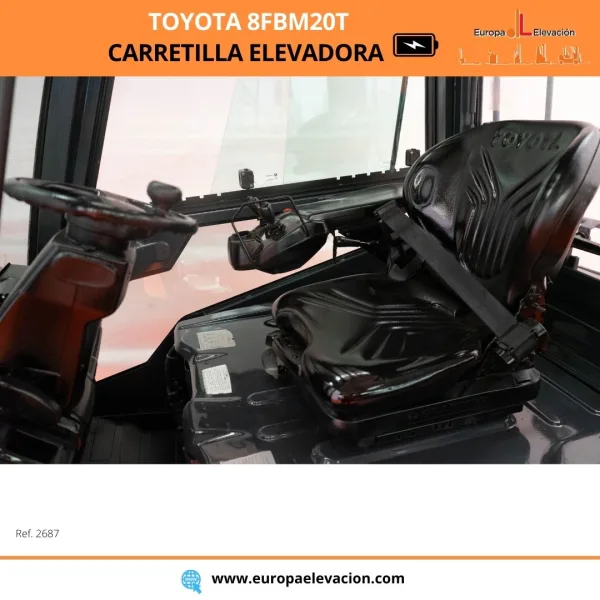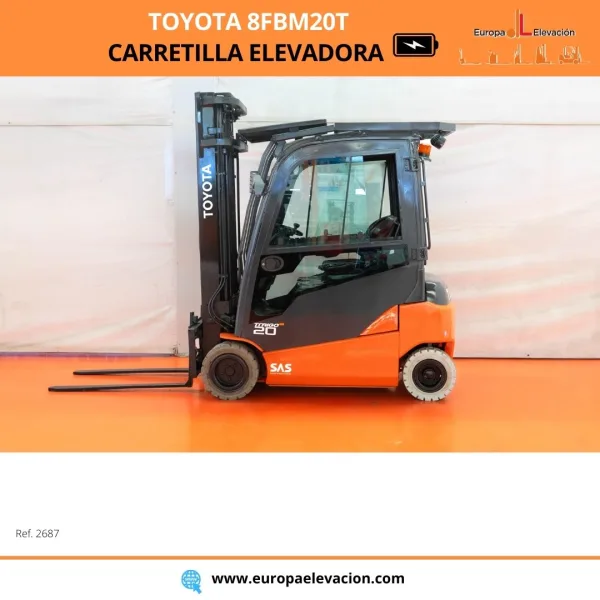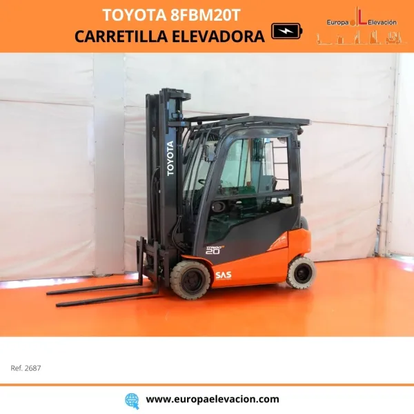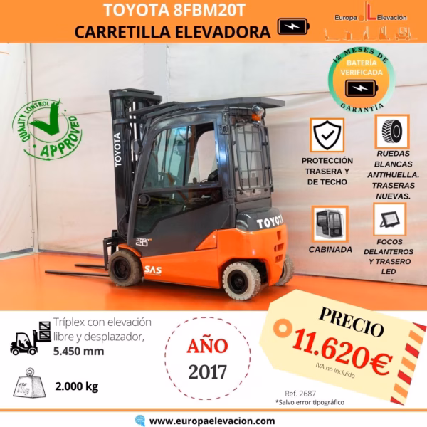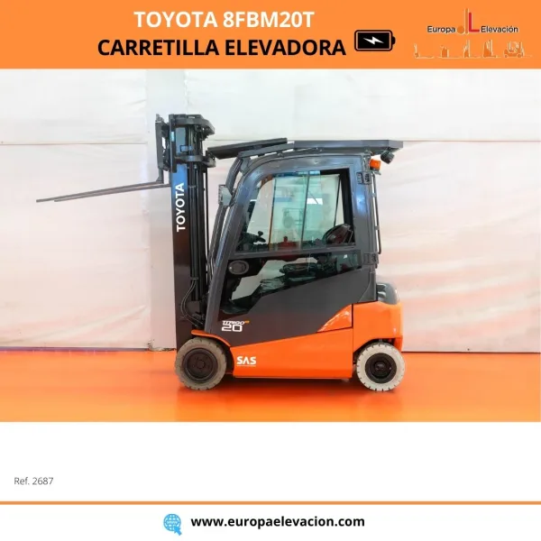 FABRICADA EN 2017. BATERÍA VERIFICADA CON 12 MESES DE GARANTÍA. PROTECCIÓN TRASERA Y DE TECHO. RUEDAS BLANCAS ANTIHUELLA. RUEDAS TRASERAS NUVAS. CABINADA. Carretilla elevadora eléctrica TOYOTA. Capacidad: 2.8000 kg. Mástil tríplex con elevación libre y desplazador, 5.450 mm. Focos delanteros y trasero LED de alta luminosidad. Respuesta rápida, eficiencia y muy buena maniobrabilidad. Ref: 2687. Modelo:8FBM20T.