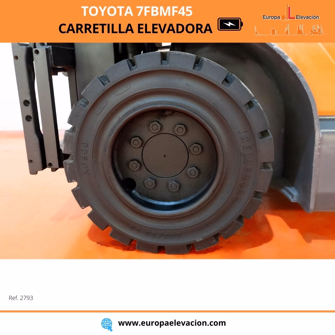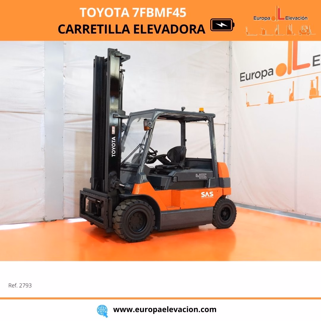 MÁQUINA FABRICADA EN 2012.BATERÍA NUEVA CON 30 MESES DE GARANTÍA. LUNA DELANTARA. 4ª VÁLVULA. BLUE SPOT. Carretilla elevadora eléctrica TOYOTA. Capacidad: 4.500 kg. Mástil dúplex con desplazador, 5.000 mm. Focos delanteros LED de alta luminosidad. Respuesta rápida, eficiencia y muy buena maniobrabilidad. Ref: 2793. Modelo:7FBMF45.