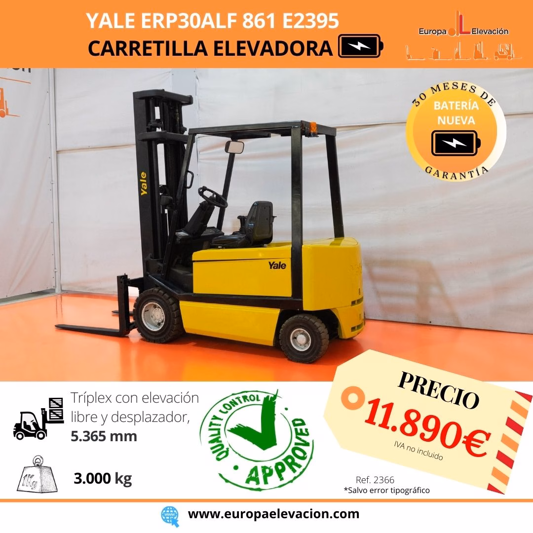 BATERÍA NUEVA CON 30 MESES DE GARANTÍA. Carretilla elevadora eléctrica YALE. Capacidad: 3.000 kg. Mástil tríplex con elevación libre y desplazador, 5.365 mm. Respuesta rápida, eficiencia y muy buena maniobrabilidad. Ref: 2366. Modelo:ERP30ALF 861 E2395.
