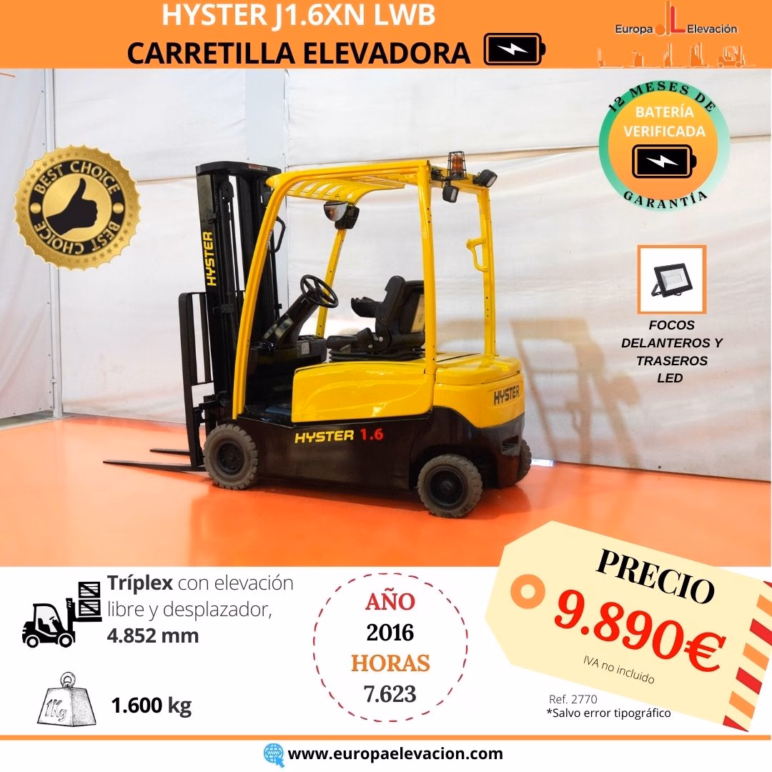MÁQUINA FABRICADA EN 2016. CON TAN SOLO 7.623 HORAS DE USO. BATERÍA VERIFICADA CON 12 MESES DE GARANTÍA. Carretilla elevadora eléctrica HYSTER. Capacidad: 1.600 kg. Mástil tríplex con elevación libre y desplazador, 4.852 mm. Focos delanteros y traseros LED de alta luminosidad. Respuesta rápida, eficiencia y muy buena maniobrabilidad. Ref: 2770. Modelo:J1.6XN lWB.