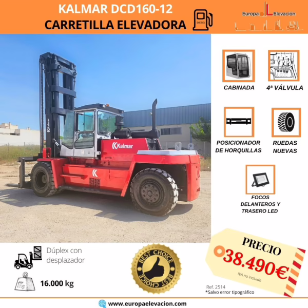 VÁVULA. POSICIONADOR DE HORQUILLAS. RUEDAS NUEVAS. CABINADA. Carretilla diésel KALMAR. Capacidad: 16.000 kg. Mástil dúplex con desplazador. Focos delanteros LED de alta luminosidad. Respuesta rápida, eficiencia y muy buena maniobrabilidad Ref: 2514. Modelo: DCD160-12. Europa Elevación. ¡Tenemos tu máquina! Llámanos sin compromiso. Disponemos de atención comercial 24 horas. Enviamos a toda España.
