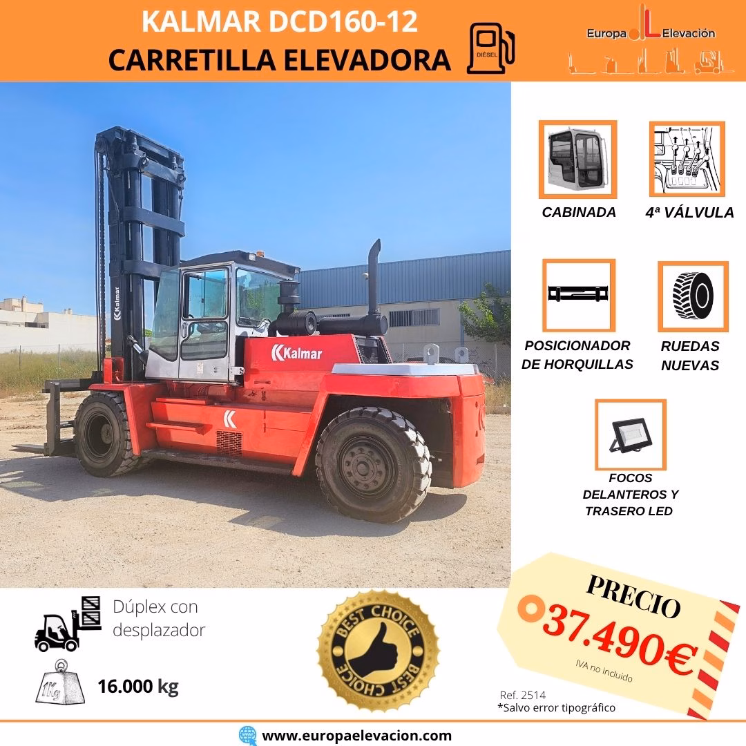 4ª VÁVULA. POSICIONADOR DE HORQUILLAS. RUEDAS NUEVAS. CABINADA. Carretilla diésel KALMAR. Capacidad: 16.000 kg. Mástil dúplex con desplazador. Focos delanteros LED de alta luminosidad. Respuesta rápida, eficiencia y muy buena maniobrabilidad Ref: 2514. Modelo: DCD160-12. Europa Elevación. ¡Tenemos tu máquina! Llámanos sin compromiso. Disponemos de atención comercial 24 horas. Enviamos a toda España.