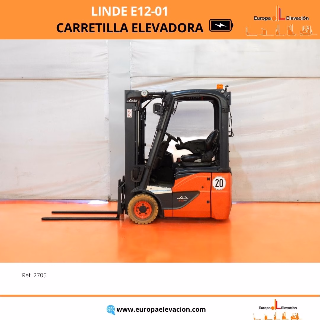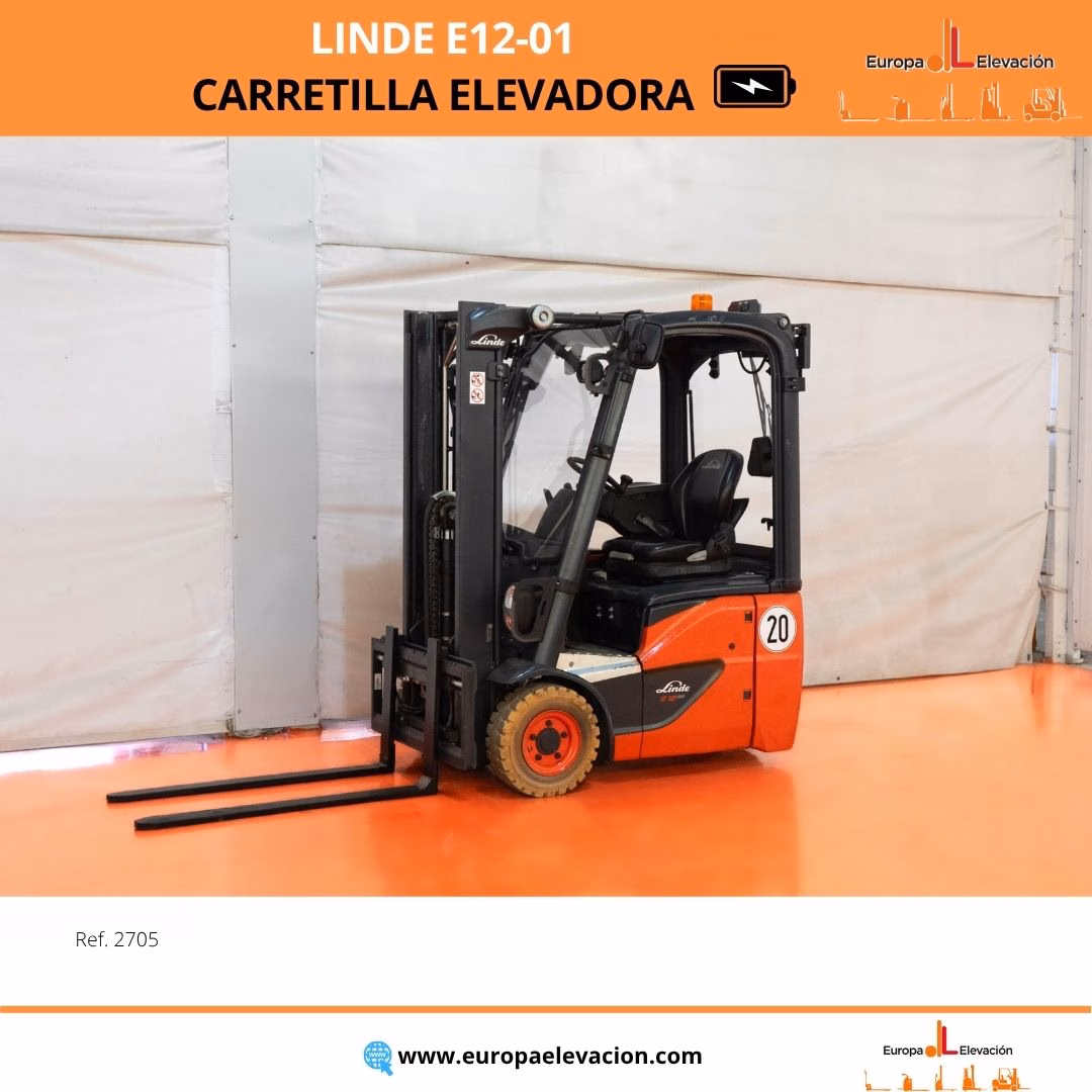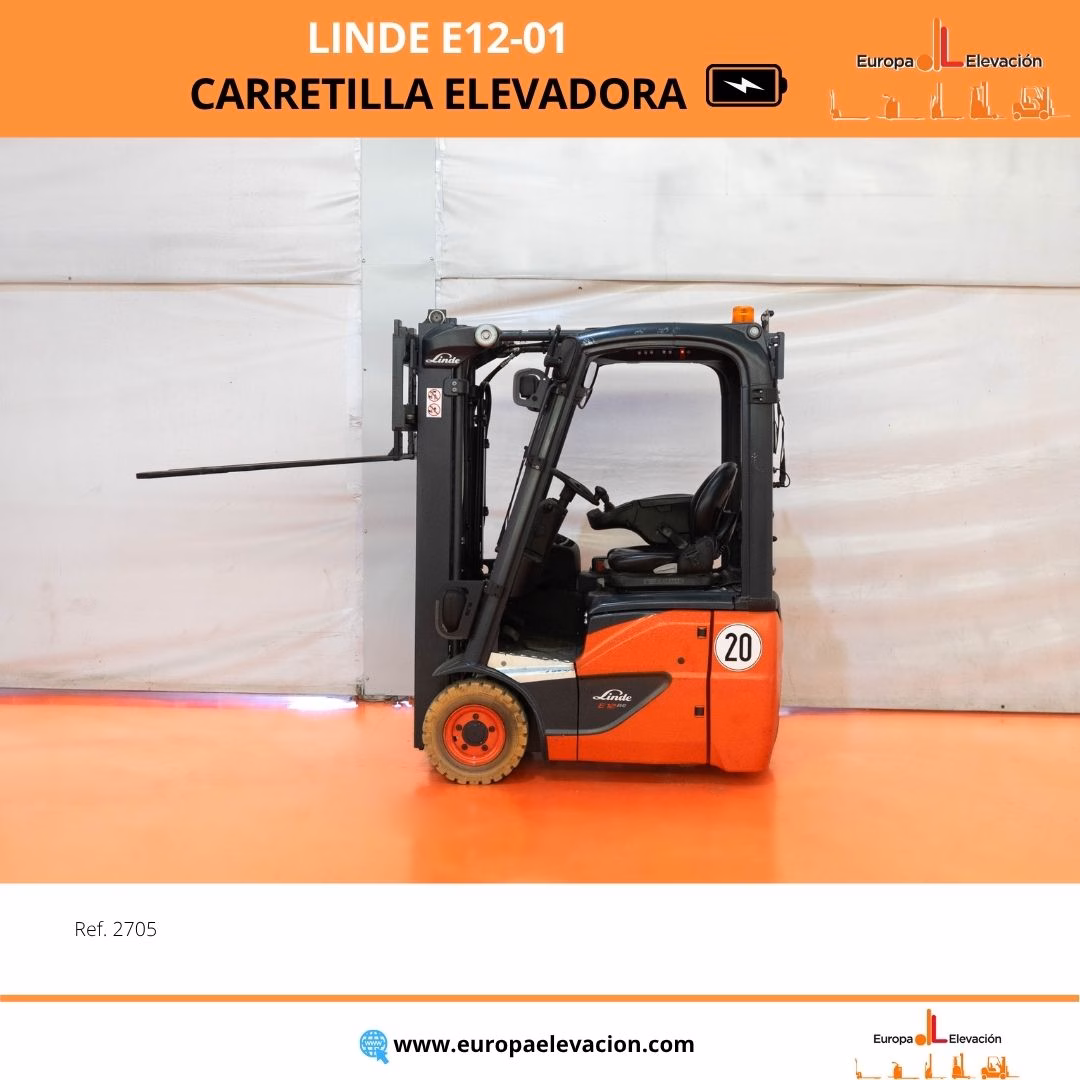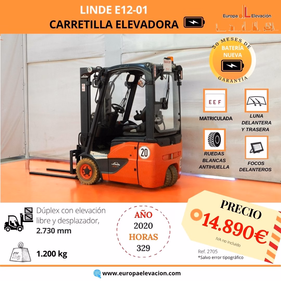 MÁQUINA FABRICADA EN 2020. CON TAN SOLO 329 HORAS DE USO. BATERÍA NUEVA CON 30 MESES DE GARANTÍA. MATRICULADA. RUEDAS BLANCAS ANTIHUELLA. LUNA DELANTERA Y TRASERA. Carretilla elevadora eléctrica LINDE. Capacidad: 1.200 kg. Mástil dúplex con elevación libre y desplazador, 2.730 mm. Focos delanteros LED de alta luminosidad. Respuesta rápida, eficiencia y muy buena maniobrabilidad. Ref: 2705. Modelo:E12-01.