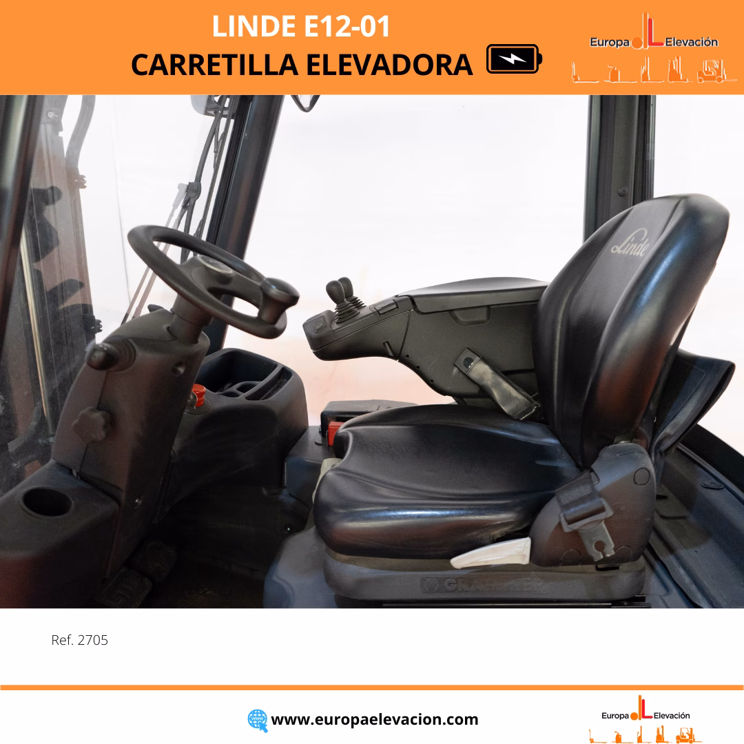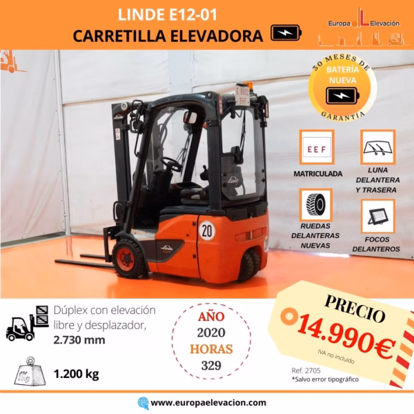 MÁQUINA FABRICADA EN 2020. CON TAN SOLO 329 HORAS DE USO. BATERÍA NUEVA CON 30 MESES DE GARANTÍA. MATRICULADA. RUEDAS DELANTERAS NUEVAS. LUNA DELANTERA Y TRASERA. Carretilla elevadora eléctrica LINDE. Capacidad: 1.200 kg. Mástil dúplex con elevación libre y desplazador, 2.730 mm. Focos delanteros LED de alta luminosidad. Respuesta rápida, eficiencia y muy buena maniobrabilidad. Ref: 2705. Modelo:E12-01.