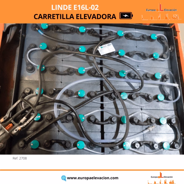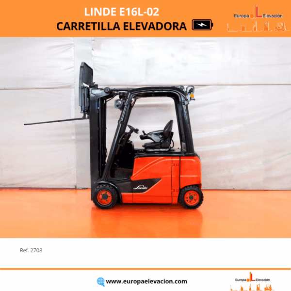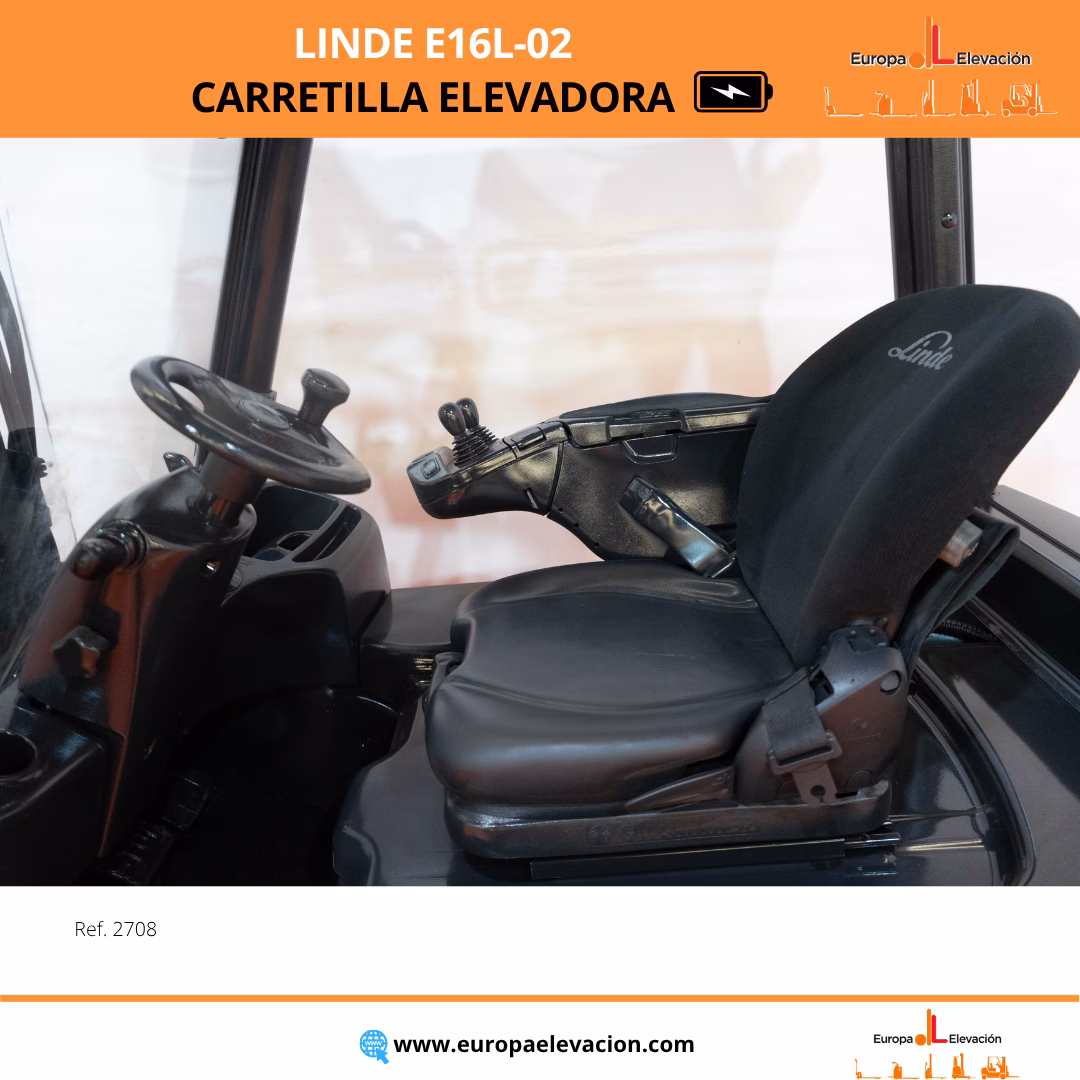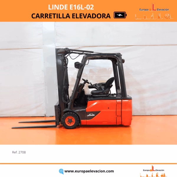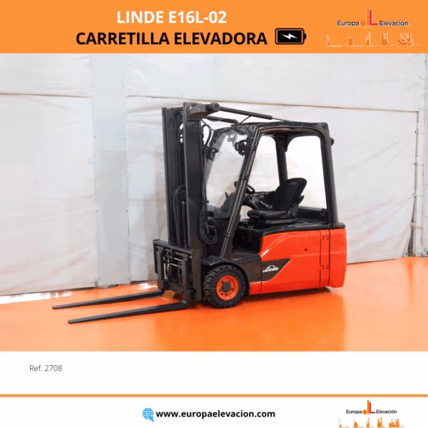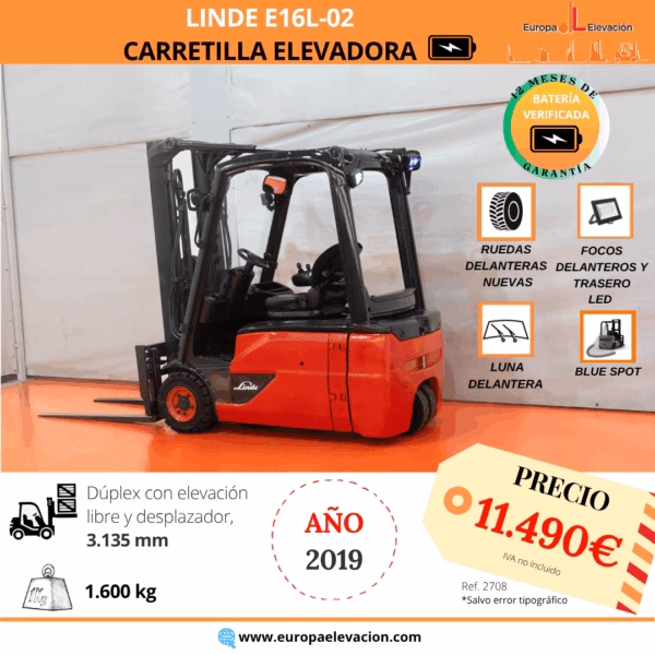 FABRICADA EN 2019. BATERÍA VERIFICADA CON 12 MESES DE GARANTÍA. RUEDAS DELANTERAS NUEVAS. LUNA DELANTERA. BLUE SPOT. Carretilla elevadora eléctrica LINDE. Capacidad: 1.600 kg. Mástil dúplex con elevación libre y desplazador, 3.135 mm. Focos delanteros y trasero LED de alta luminosidad. Respuesta rápida, eficiencia y muy buena maniobrabilidad. Ref: 2708. Modelo:E16L-02.
