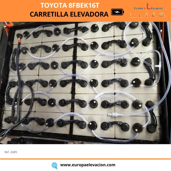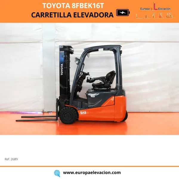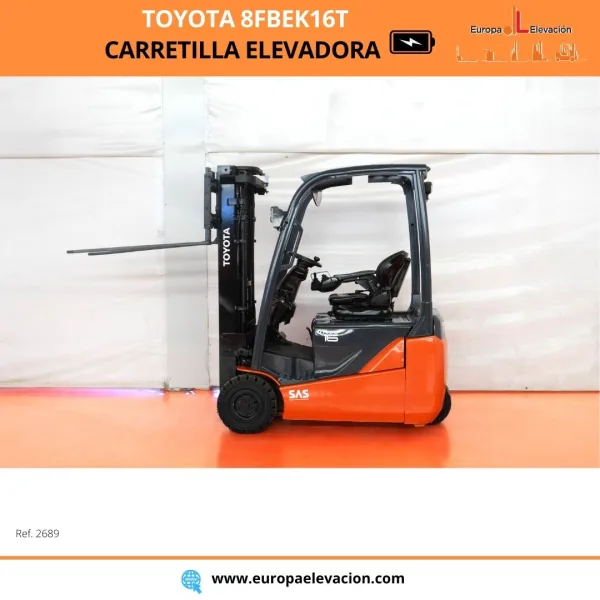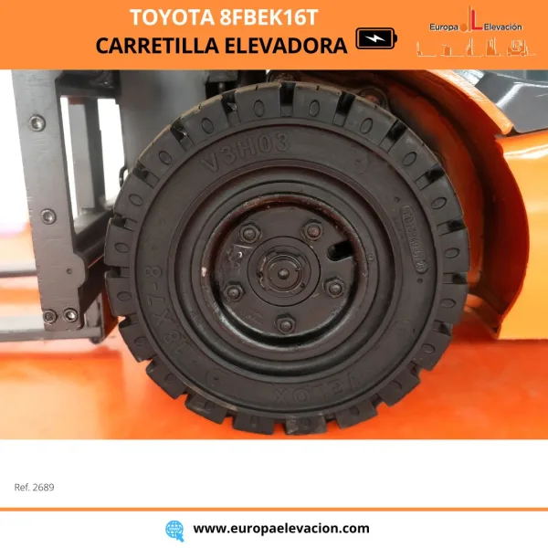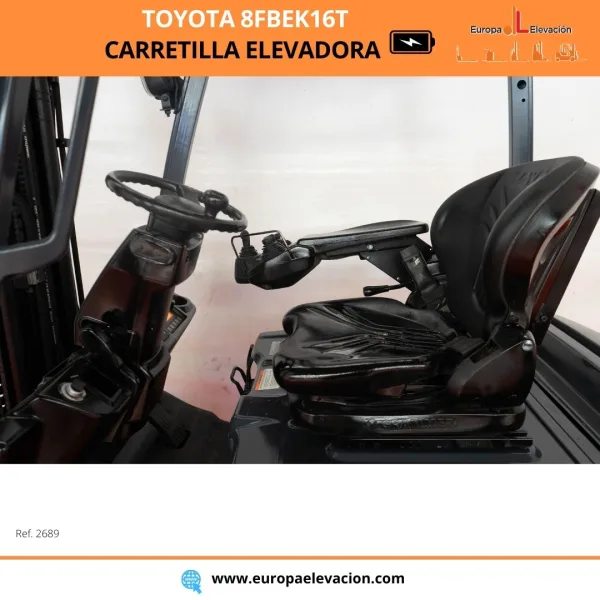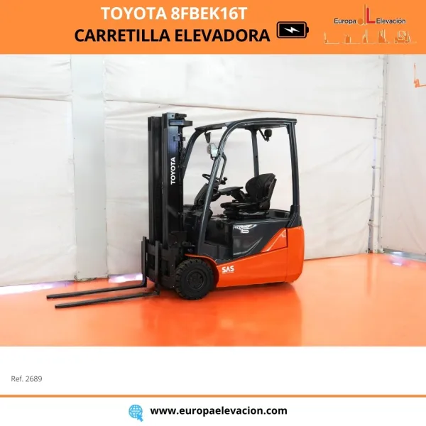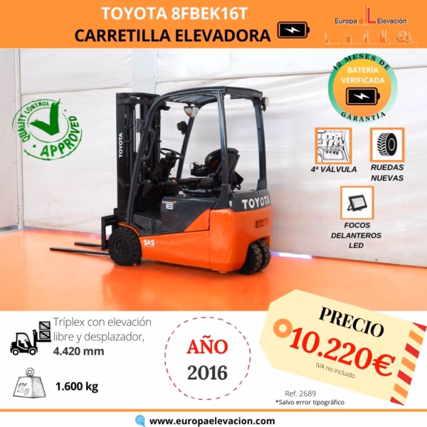 FABRICADA EN 2016. BATERÍA VERIFICADA CON 12 MESES DE GARANTÍA. RUEDAS NUEVAS. 4ª VÁLVULA. Carretilla elevadora eléctrica TOYOTA. Capacidad: 1.600 kg. Mástil tríplex con elevación libre y desplazador, 4.420 mm. Focos delanteros LED de alta luminosidad. Respuesta rápida, eficiencia y muy buena maniobrabilidad. Ref: 2689. Modelo:8FBEK16T.