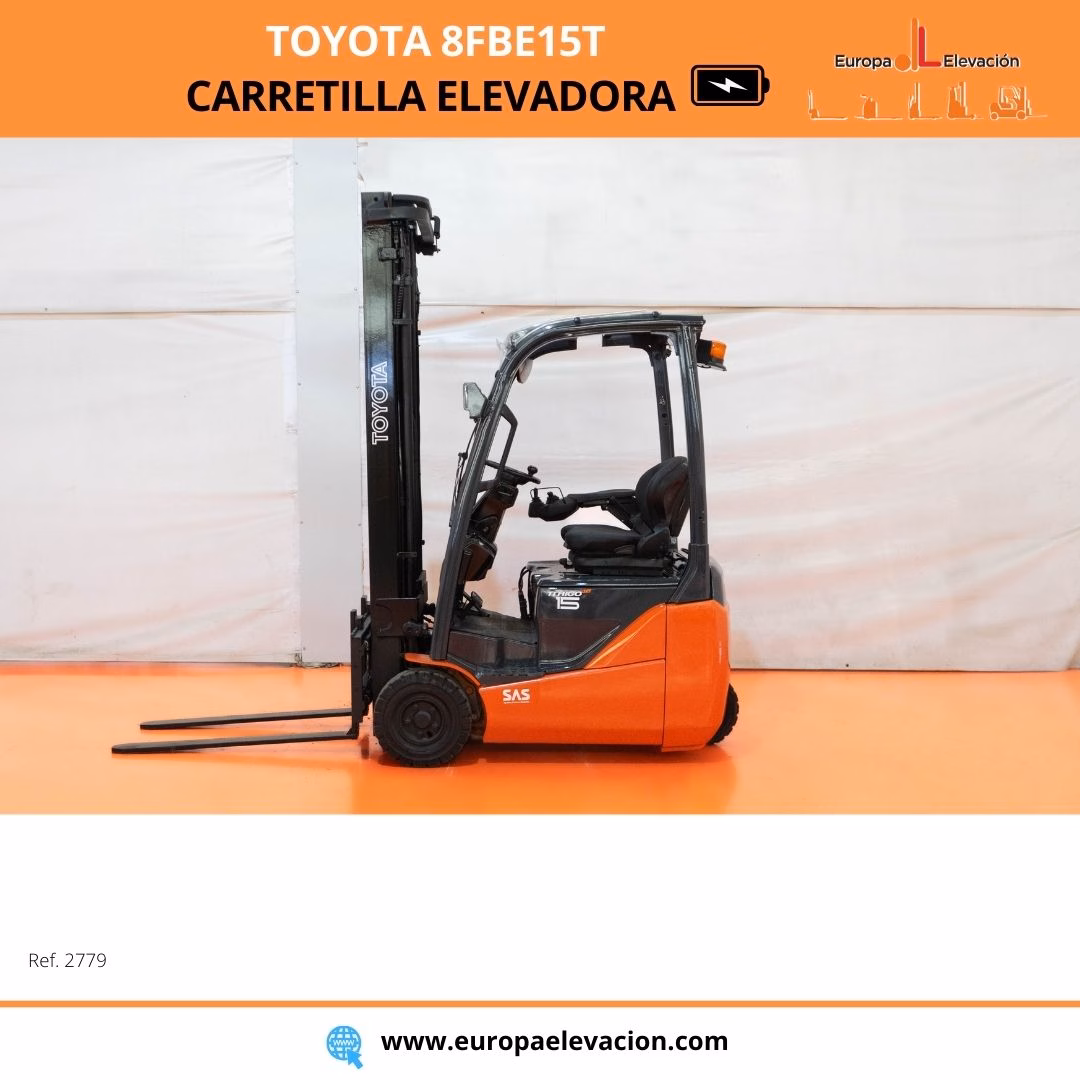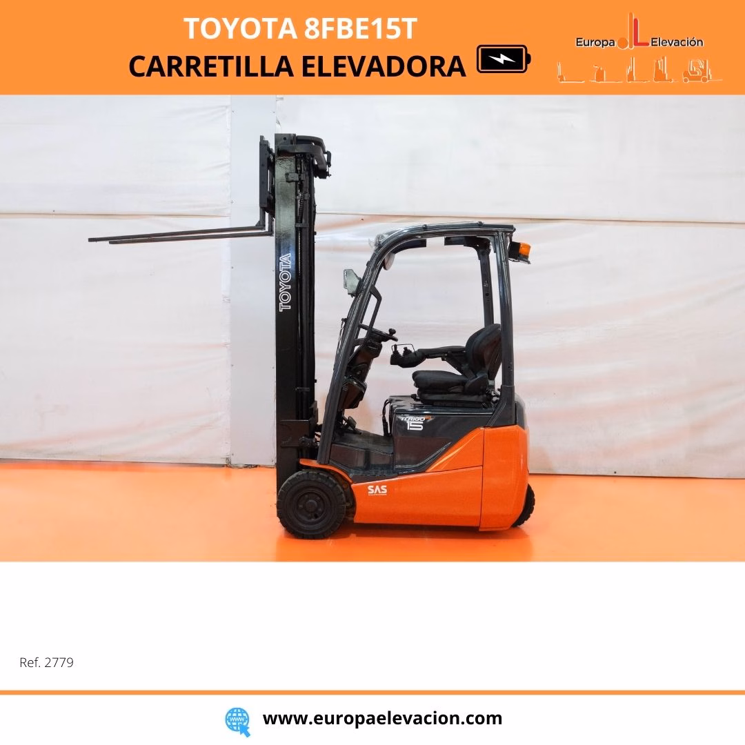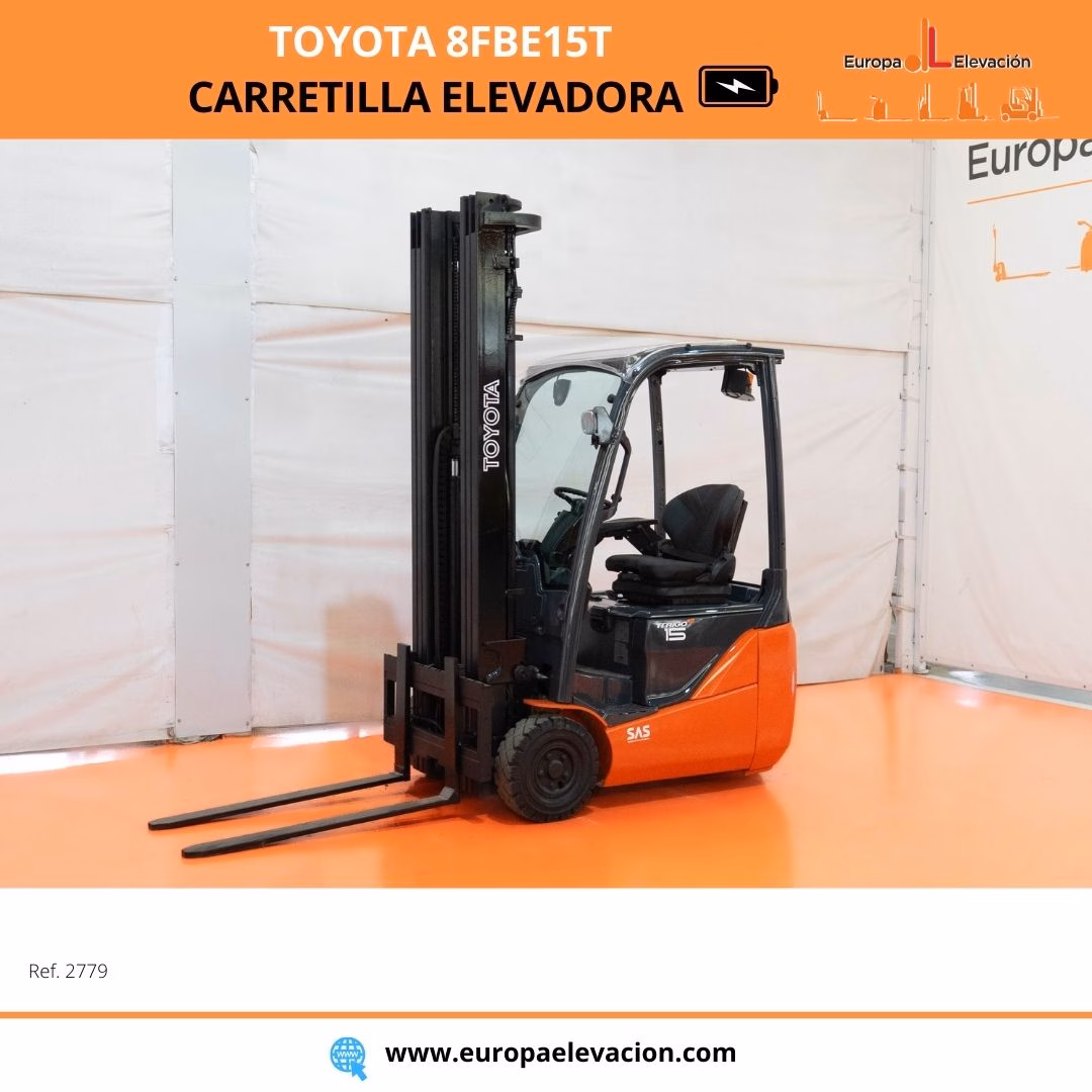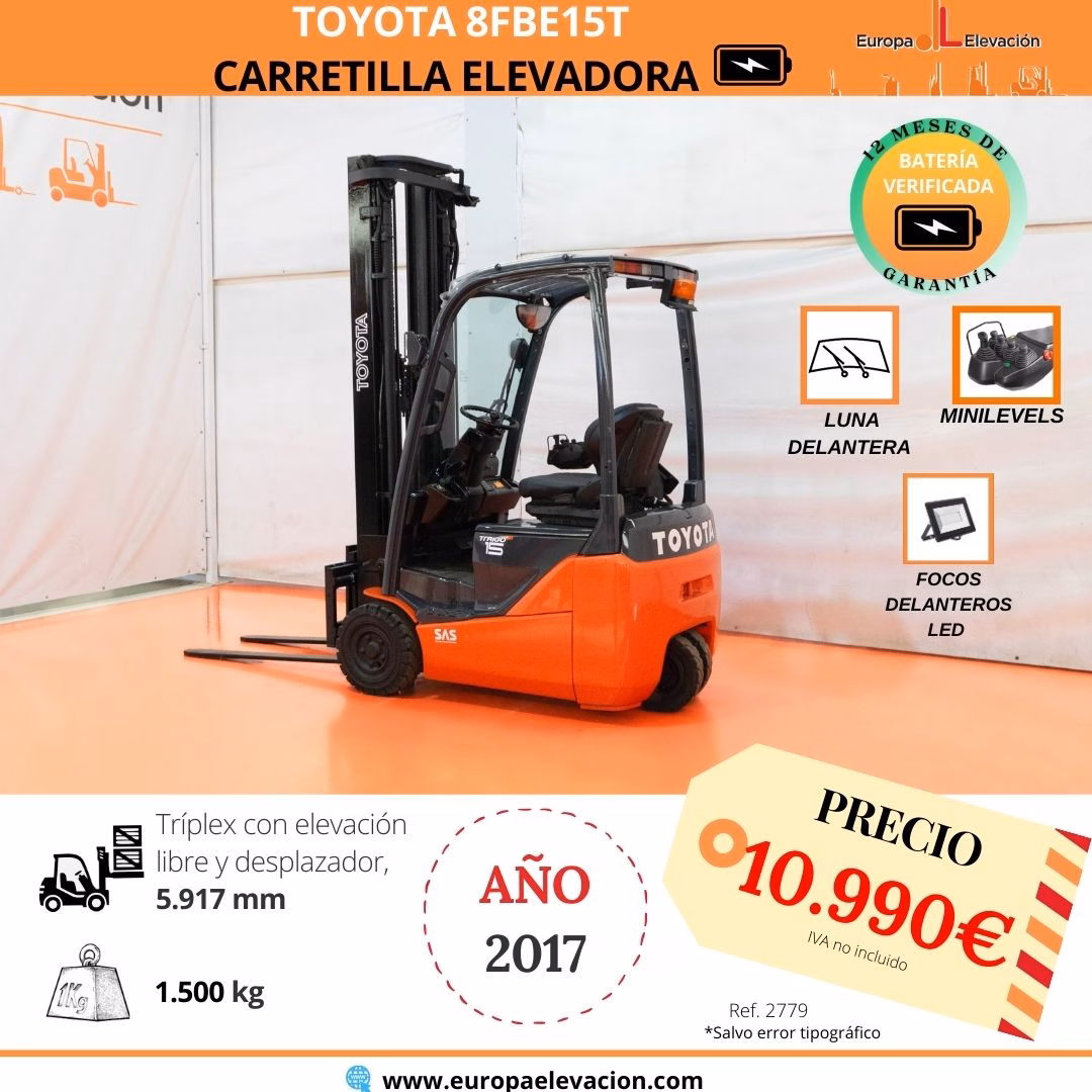 MÁQUINA FABRICADA EN 2017. LUNA DELANTERA. LUNA DELANTERA. MINILEVELS. Carretilla elevadora eléctrica TOYOTA. Capacidad: 1.500 kg. Mástil tríplex con elevación libre y desplazador, 5.917 mm. Luces delanteras LED de alta luminosidad. Respuesta rápida, eficiencia y muy buena maniobrabilidad. Ref: 2779. Modelo:8FBE15T.