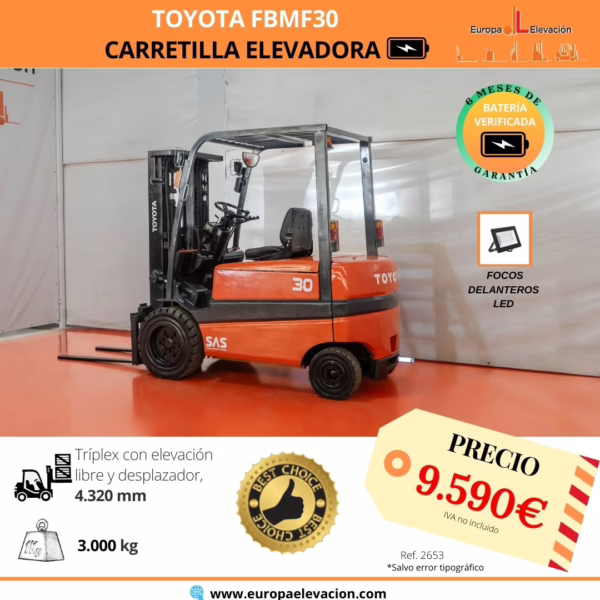 BATERÍA VERIFICADA. Carretilla elevadora eléctrica TOYOTA. Capacidad: 3.000 kg. Mástil tríplex con elevación libre y desplazador, 4.320 mm. Focos delanteros LED de alta luminosidad. Respuesta rápida, eficiencia y muy buena maniobrabilidad. Ref: 2653. Modelo:FBMF30.