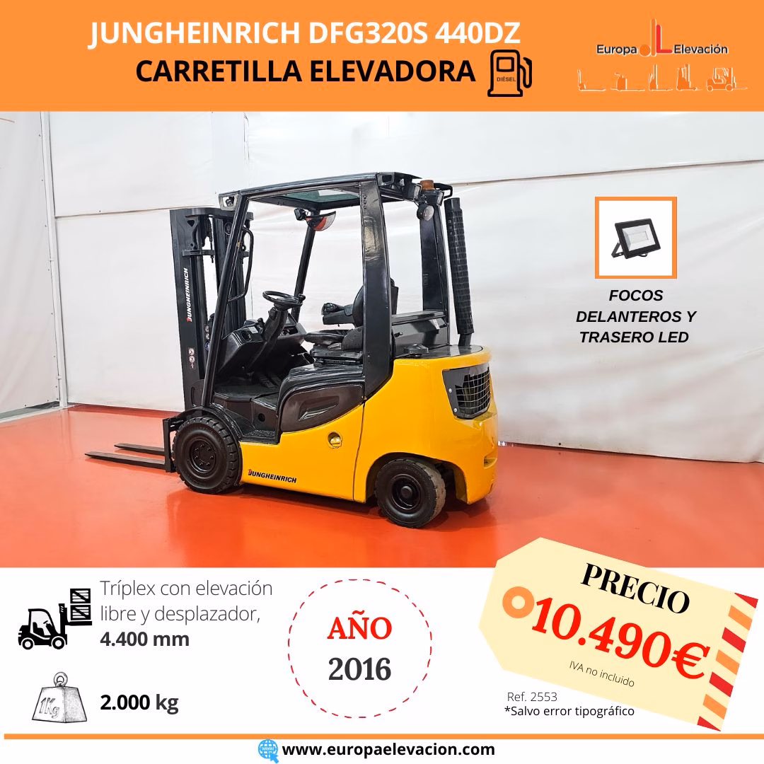 MÁQUINA FABRICADA EN 2016. Carretilla diésel JUNGHEINRICH. Capacidad: 2.000 kg. Mástil tríplex con elevación libre y desplazador, 4.400 mm. Focos delanteros y traseros LED de alta luminosidad. Respuesta rápida, eficiencia y muy buena maniobrabilidad Ref: 2553. Modelo: DFG320S 440DZ.