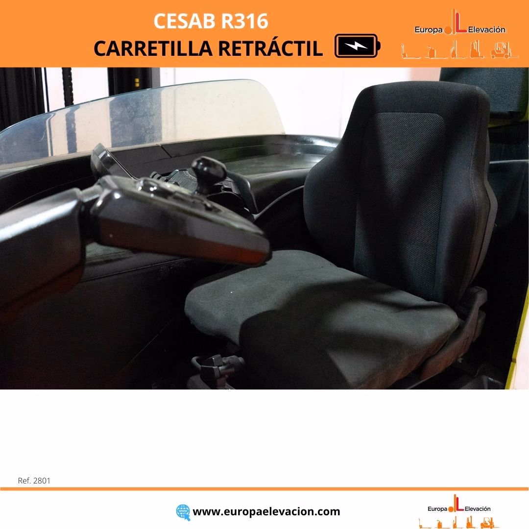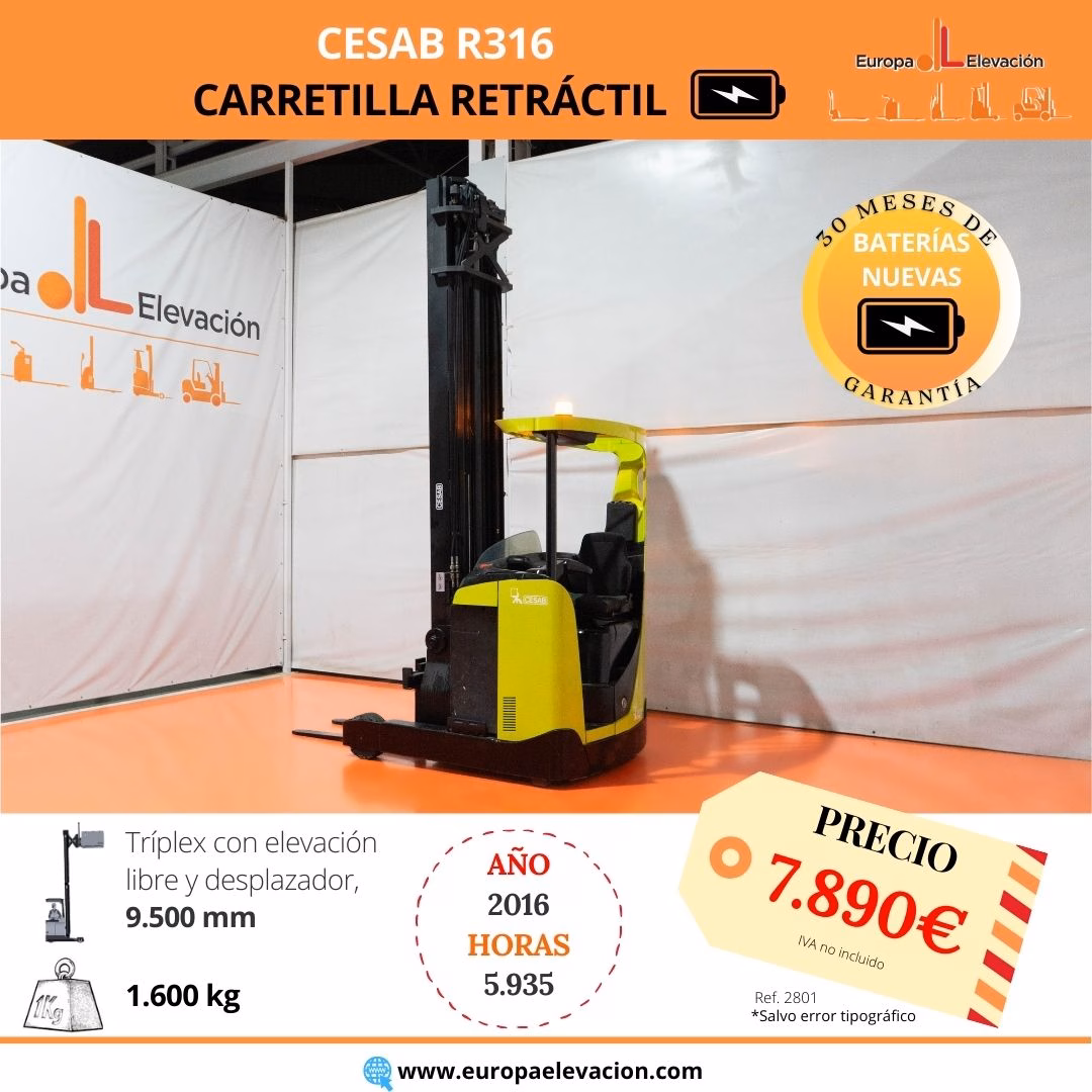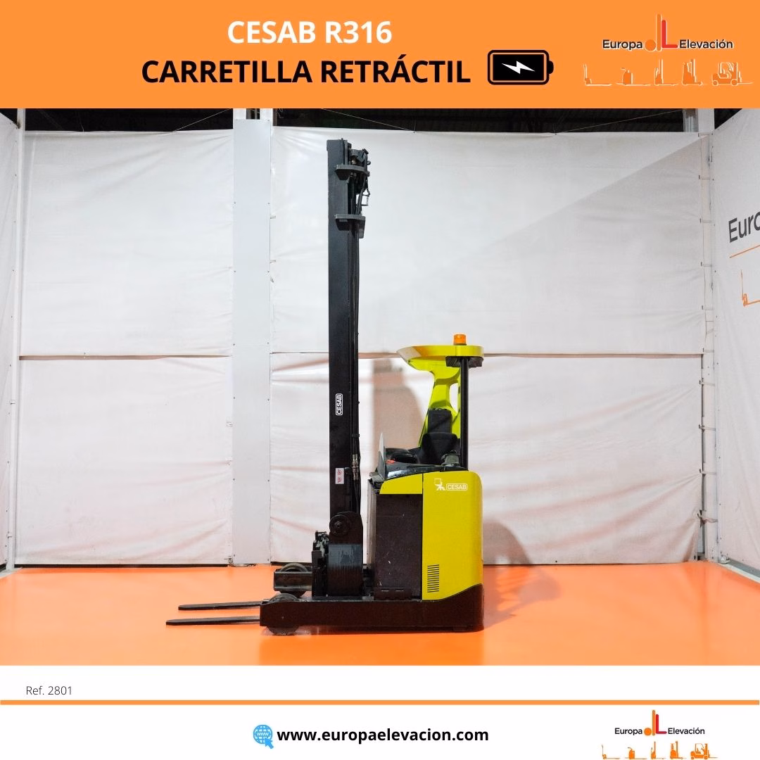 AÑO 2016. CON TAN SOLO 5.935 HORAS. BATERÍA NUEVA CON 30 MESES DE GARANTÍA. Carretilla retráctil eléctrica CESAB. Capacidad: 1.600 kg. Mástil tríplex con elevación libre y desplazador, 9.500 mm. Respuesta rápida, eficiencia y muy buena maniobrabilidad. Ref: 2801. Modelo:R316.