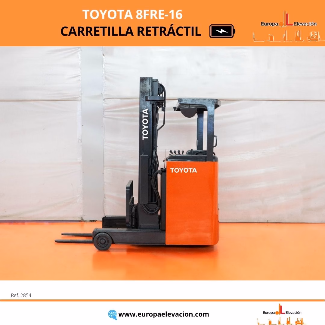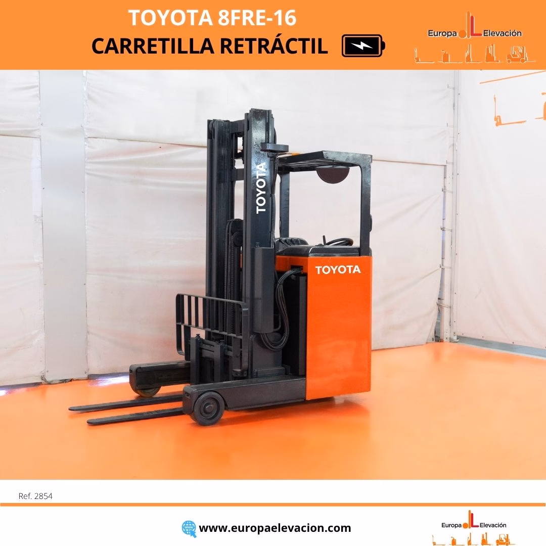 CON SOLO 3.444 HORAS. BATERÍA NUEVA CON 30 MESES DE GARANTÍA. 4ª VÁLVULA. Carretilla elevadora retráctil eléctrica TOYOTA. Capacidad: 1.600 kg. Mástil tríplex con elevación libre y desplazador, 5.479 mm. Respuesta rápida, eficiencia y muy buena maniobrabilidad. Ref: 2854. Modelo:8FRE-16.