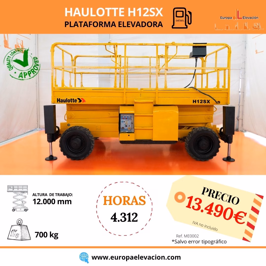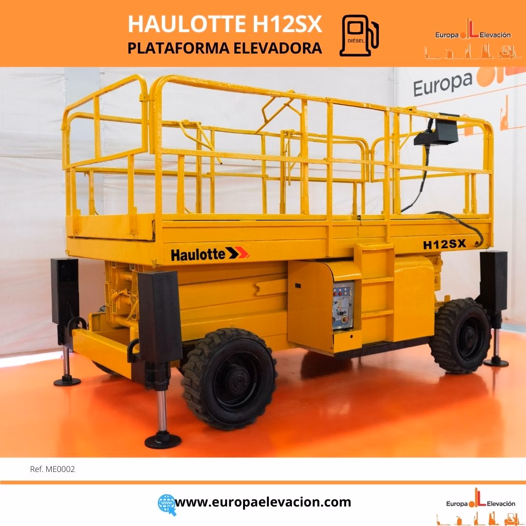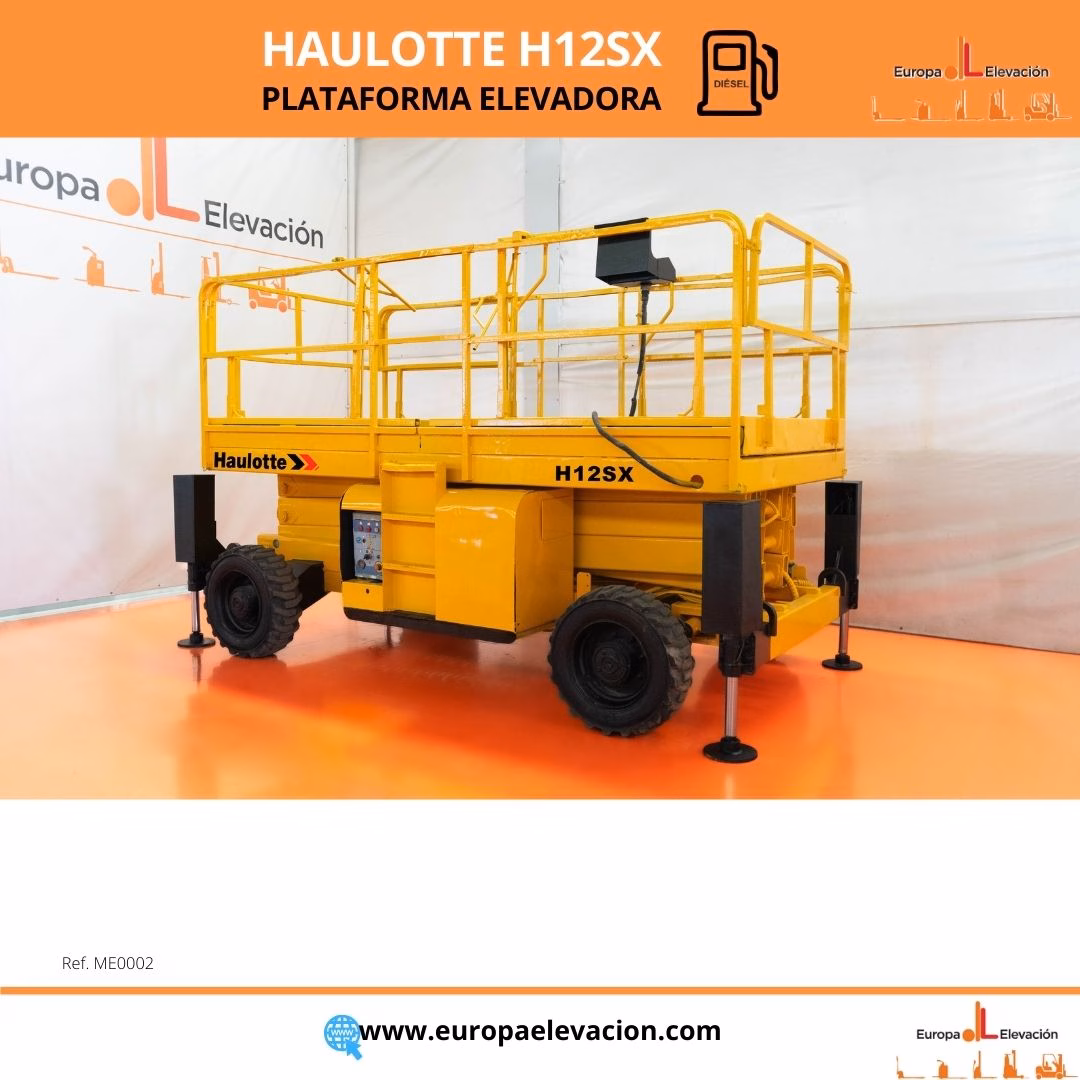CON TAN SOLO 4.312 HORAS DE USO. Plataforma elevadora diésel HAULOTTE. Capacidad: 700 kg. Altura de trabajo: 12.000 mm. Respuesta rápida, eficiencia y muy buena maniobrabilidad. Ref: ME0002. Modelo:H12SX.