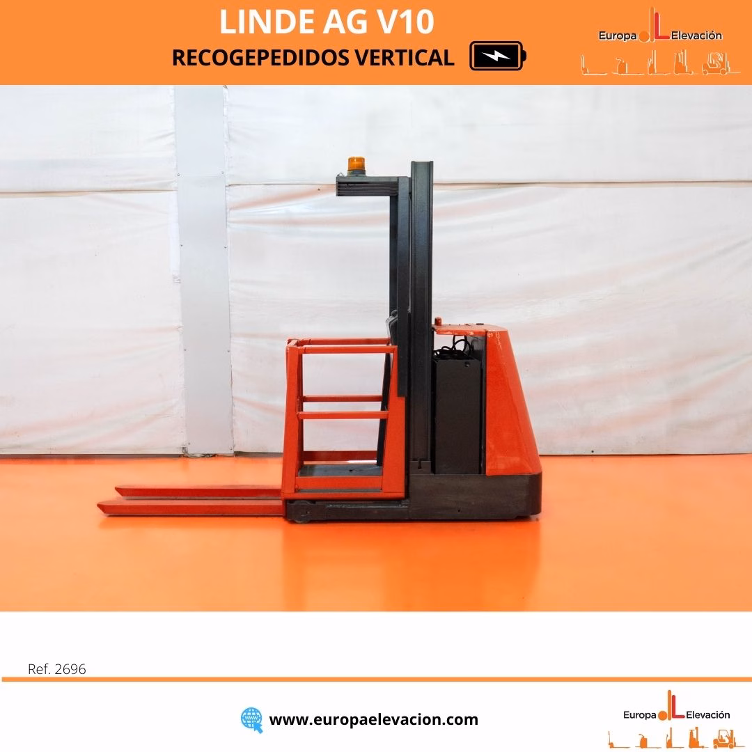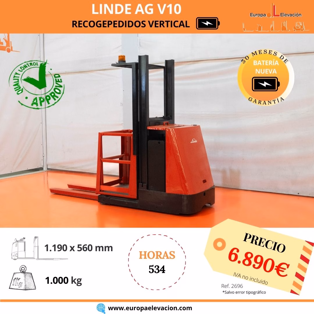CON TAN SOLO 537 HORAS DE USO. BATERÍA NUEVA CON 30 MESES DE GARANTÍA. Recogepedidos eléctrico LINDE. Capacidad: 1.000 kg. Tamaño de horquillas: 1.190 x 560 mm. Respuesta rápida, eficiencia y muy buena maniobrabilidad. Ref: 2696. Modelo:AG V10.