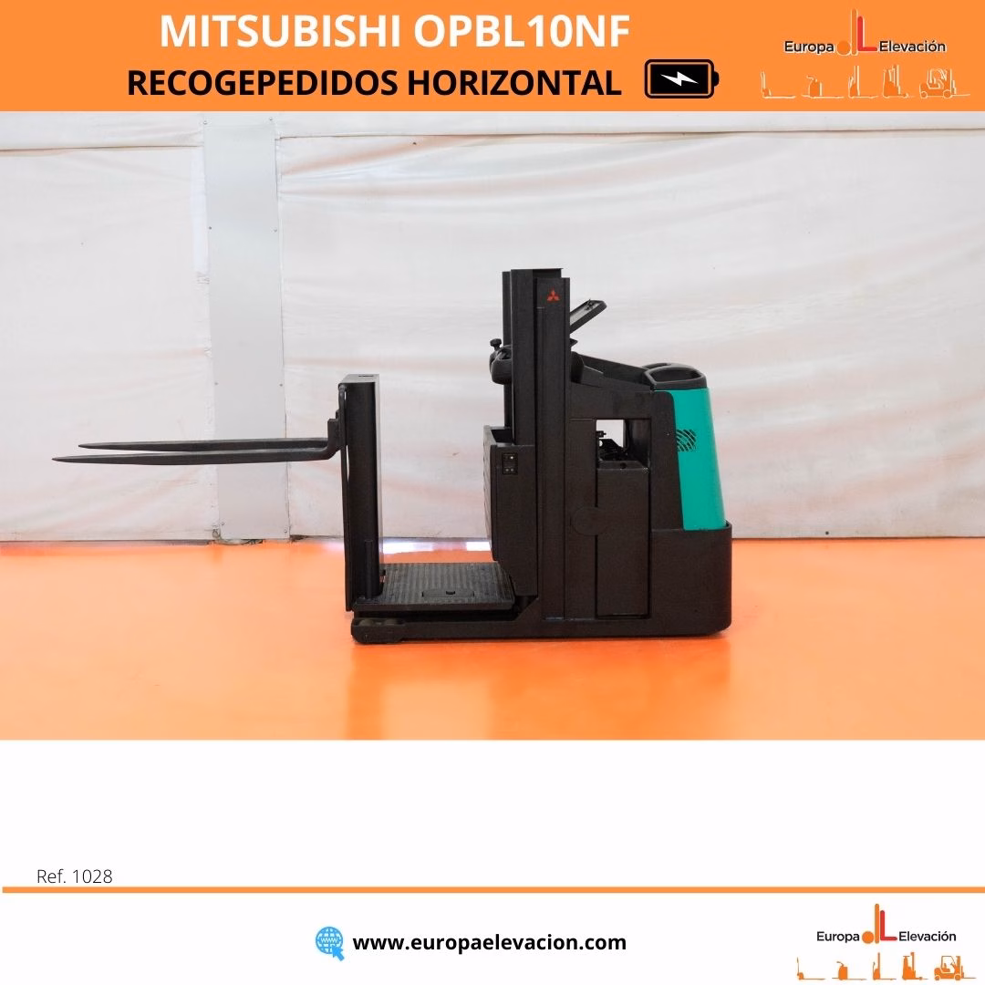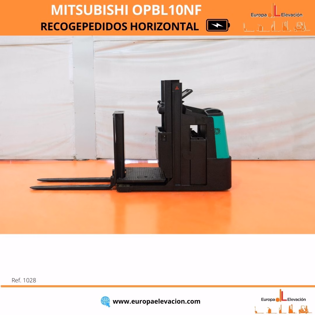 AÑO 2010. BATERÍA NUEVA CON 30 MESES DE GARANTÍA. Recogepedidos horizontal Mitsubishi. Capacidad: 1.000 kg. Tamaño de horquillas: 1.150 x 550 mm. Respuesta rápida, eficiencia y muy buena maniobrabilidad. Ref: 1028. Modelo:OPBL10NF.