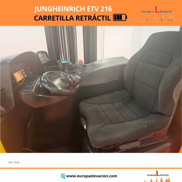 BATERÍA VERIFICADA CON 12 MESES DE GARANTÍA. MÁQUINA FABRICADA EN 2015. Carretilla retráctil eléctrica JUNGHEINRICH. Capacidad: 1.600 kg. Mástil tríplex con elevación libre y desplazador, 10.300 mm. Respuesta rápida, eficiencia y muy buena maniobrabilidad. Ref: 2540. Modelo: ETV 216.